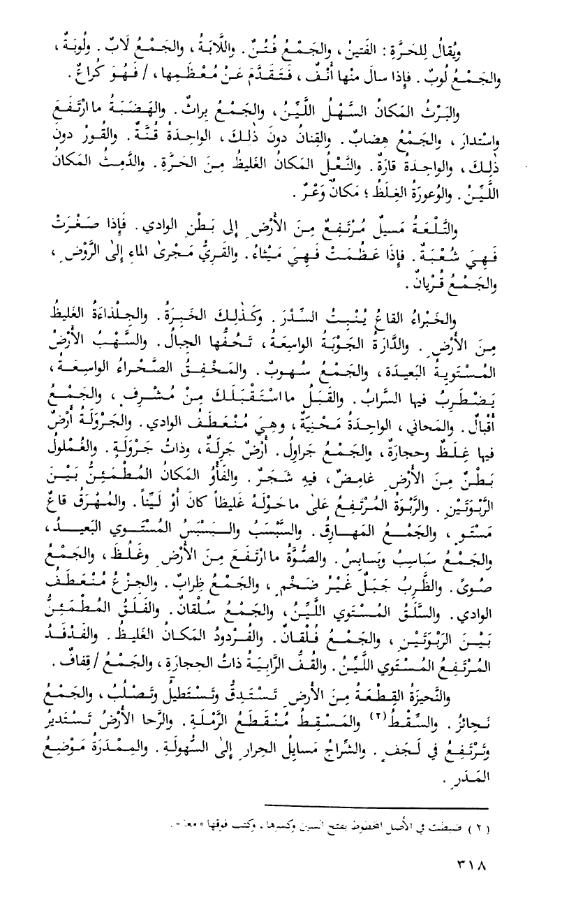 والخبراءُ القاعُ ينبتُ السِّدرَ. وكذلكَ الخبرةُ. والجلذاءةُ الغليظُ منَ الأرضِ. والدَّارةُ الجوبةُ الواسعةُ، تحفُّها الجبالُ. والسَّهبُ الأرضُ المستويةُ البعيدَة، والجمعُ سهوبٌ. والمخْفقُ الصَّحراءُ الواسعةُ، يضطربُ فيها السَّرابُ. والقبلُ ما استقبلكَ منْ مشرفِ، والجمعُ أقبالٌ. والمحاني، الواحدةُ محنيةٌ، وهيَ منعطفُ الوادي. والجرولةُ أرضٌ فيها غلظٌ وحجارةٌ، والجمعُ جراولُ. أرضٌ جرلةٌ، وذاتُ جرولةٍ. والغملولُ بطنٌ منَ الأرضِ غامضٌ، فيهِ شجرٌ. والفأوُ المكانُ المطمئنُّ بين الرَّبوتينِ. والرَّبوةُ المرتفعُ عَلى ما حَولهُ غليظاً كانَ أوْ