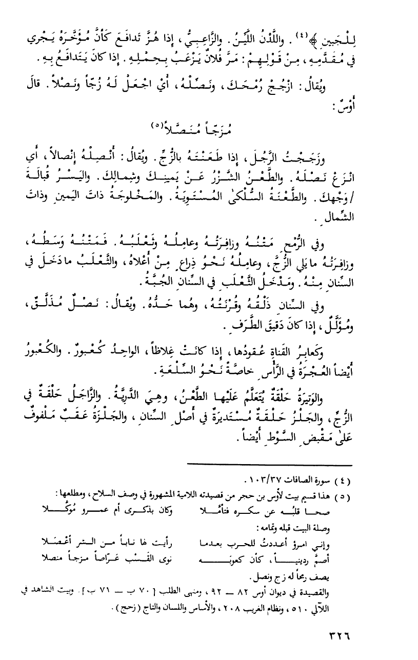 وزجَجْتُ الرَّجلَ، إِذَا طعنته بالزُّجِّ. ويُقالُ: أنصلهُ إنصالاً، أي انزعْ نصلهُ. والطَّعنُ الشَّزرُ عنُ يمينكَ وشمالكَ. واليسرُ قبالةَ وجهكَ. والطَّعنةُ السُّلْكَى المستويةُ. والمخلوجةُ ذاتَ اليمينِ وذاتَ الشَّمالِ.
