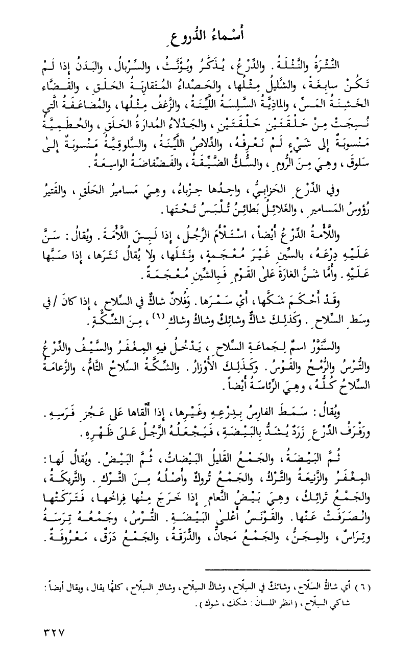 النَّثرةُ والنَّثلةُ، والدِّرعُ، يذكَِّر ويؤنَّثُ، والسِّربالُ، والبدنُ إِذَا لمْ تكنْ سابغةً، والشَّليلُ مثلُها، والحصداءُ المتقاربةُ الحلقِ، والقضَّاء الخشنةُ المسِّ، والماذيَّة السَّلسةُ اللَّيِّنةُ، والزَّغفُ مثلُها، والمضاعفةُ الَّتِي نسجتْ منْ حلقتينِ حلقتينِ، والجدلاءُ المدارةُ الحلقِ، والحطميَّةُ منسوبةٌ إِلَى شيءٍ لمْ نعرفهُ، والدِّلاصُ اللَّيِّنةُ، والسَّلوقيَّةُ منسوبةٌ إِلَى سلوقَ، وهيَ منَ الرُّومِ، والسُّكُّ الضَّيِّقةُ، والفضفاضةُ الواسعةُ.
