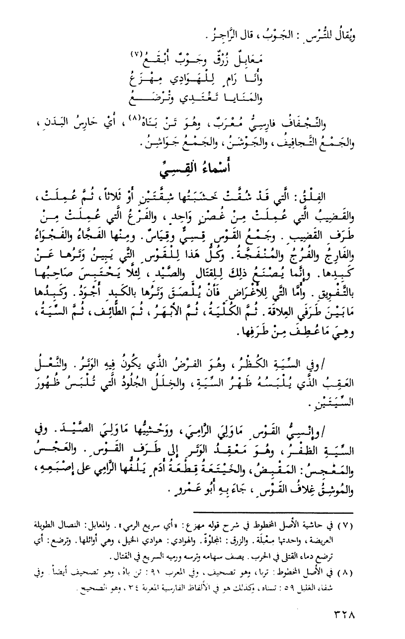 الفلقُ: الَّتِي قدْ شقَّتْ خشبتُها شقَّتينِ أوْ ثلاثاً، ثمَّ عملتْ، والقضيبُ الَّتِي عملتْ منْ غصنٍ واحدٍ، والفرعُ الَّتِي عملتْ منْ طرفِ القضيبِ. وجمعُ القوسِ قسيٌّ وقياسٌ. ومنْها الفجَّاءُ والفجواءُ والفارجُ والفرجُ والمنفجَّةُ. وكلُّ هَذَا للقوسِ الَّتِي يبينُ وترُها عنْ كبدِها. وإنَّما يصنعُ ذلكَ للقتالِ والصَّيدِ، لئلَّا يحتبسَ صاحبُها بالتَّفويقِ. وأمَّا الَّتِي للأغراضِ فأنْ يلصقَ وترُها بالكبدِ أجودُ. وكبدُها ما بينَ طرفي العلاقة. ثمَّ الكليةُ، ثمَّ الأبهرُ، ثمَّ الطَّائف، ثمَّ السِّيةُ، وهيَ مَا عطفَ منْ طرفِها.