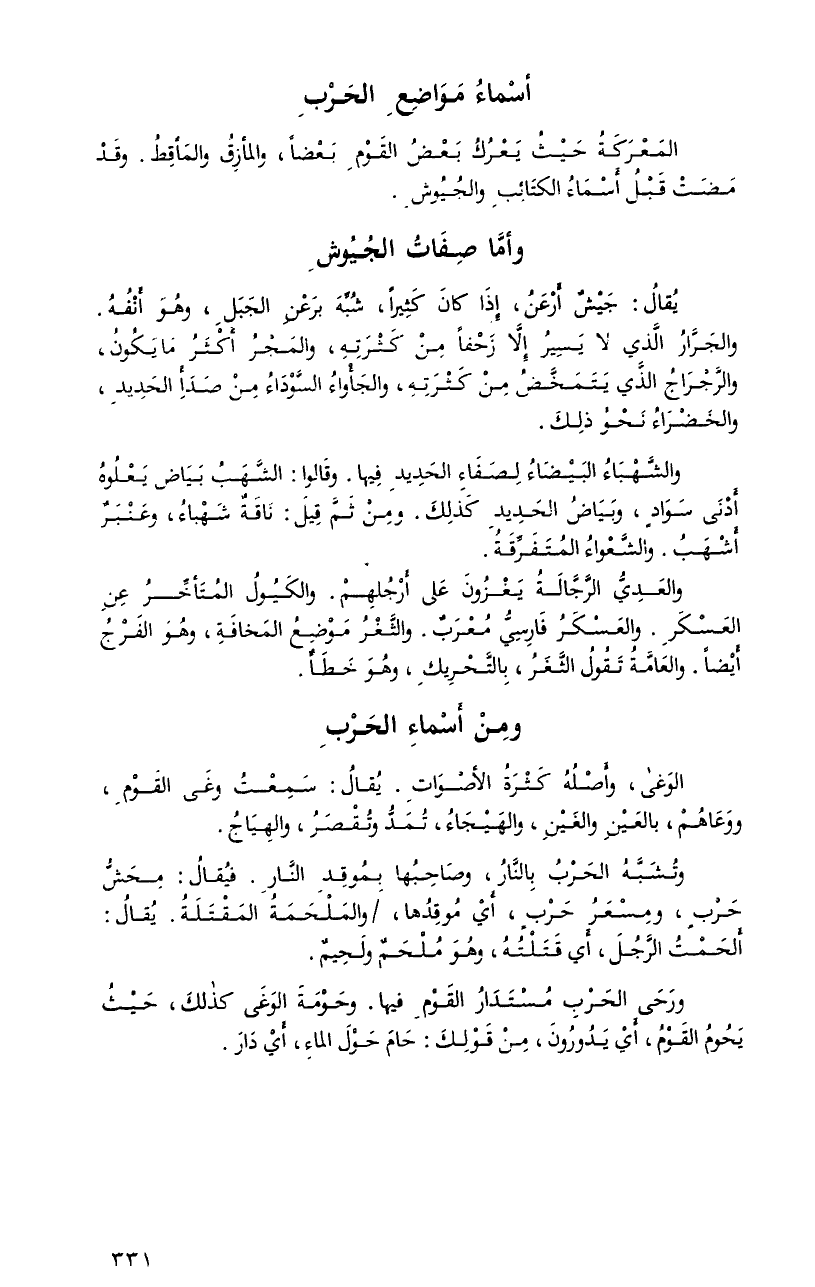 والعديُّ الرَّجَّالةُ يغزونَ على أرجلهمْ. والكيولُ المتأخِّرُ عنِ العسكرِ. والعسكرُ فارسيُّ معربٌ. والثَّغرُ موضعُ المخافةِ، وهوَ الفرجُ أيضاً، والعاَّمة تقولُ الثَّغرُ، بالتَّحريكِ، وهوَ خطأٌ.