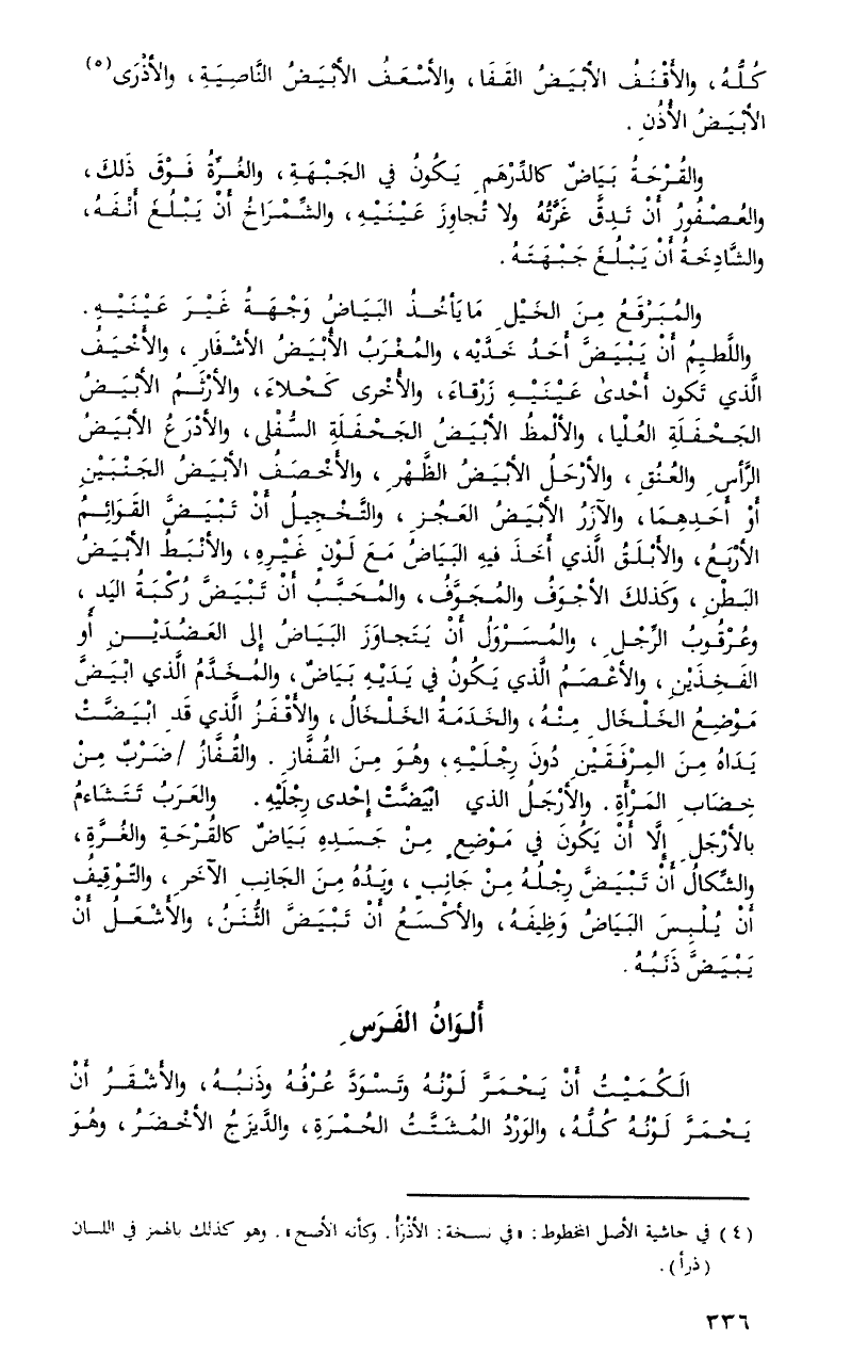 والمبرقعُ منَ الخيلِ ما يأخذُ البياضُ وجهةُ غيرَ عينيهِ. واللَّطيِمُ أنُ يبيضَّ أحدُ خدَّيه، والمغربُ الأبيضُ الأشفارِ، والأخيفُ الَّذِي تكون أَحدى عينيه زرقاءَ، والأخرى كحلاءَ، والأرثمُ الأبيضُ الجحفلةِ العليا، والألمظُ الأبيضُ الجحفلةِ السُّفلى، والأدرعُ الأبيضُ الرَّأسِ والعنقِ، والأرحلُ الأبيضُ الظَّهرُ، والأخصفُ الأبيضُ الجنبينِ أو أحدهمَا، والآزرُ الأبيضُ العجزِ، والتَّخجيلُ أنْ تبيضَّ القوائمُ الأربعُ، والأبلقُ الَّذِي أخذَ فيهِ البياضُ معَ لونٍ غيرهِ، والأنبطُ الأبيضُ البطنِ، وكذلكَ الأجوفُ والمجوَّفُ، والمحبَّبُ أنْ تبيضَّ ركبةُ اليدِ، وعرقوبُ الرِّجلِ، والمسرولُ أنْ يتجاوزَ البياضُ إِلَى العضدينِ أو الفخذينِ، والأعصمُ الَّذِي يكونُ فِي يديهِ بياضٌ، والمخدَّمُ الَّذِي ابيضَّ موضعُ الخلخالِ منهُ، والخدمةُ الخلخالُ، والأقفزُ الَّذِي قدِ ابيضَّتْ يداهْ منَ المرفقينِ دونَ رجليهِ، وهوَ منَ القفَّازِ. والقفَّازُ ضربٌ منْ خضابِ المرأةِ. والأرجلُ الَّذِي ابيضَّتْ إحدى رجليهِ. والعربُ تتشاءمُ بالأرجلِ إِلاَّ أنْ يكونَ فِي موضعٍ من جسدهِ بياضٌ كالقرحةِ والغرَّةِ، والشِّكالُ أنْ تبيضَّ رجلهُ منْ جانبٍ، ويدهُ من الجانبِ الآخرِ، والتّوقيفُ أنْ يلبسَ البياضُ وظيفهُ، والأكسعُ أنْ تبيضَّ الثُّننُ، والأشعلُ أنْ يبيضَّ ذنبهُ.