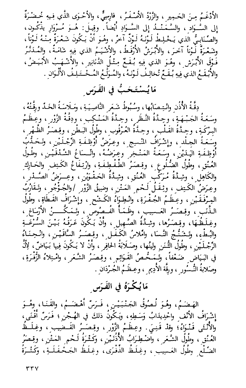 دقةُ الأذنِ وانتصابُها، وسبوطُ شعرِ النَّاصيةِ، وملاسةُ الخدِّ ورقَّتهُ، وسعةُ الجبهةِ، وحدَّة النَّظرِ، وحدَّة المنكبِ، ودقَّة الزَّورِ، وعظمُ البركةِ، وحدَّةُ القلبِ، وحدَّةُ العرقوبِ، وطولُ البطنِ، وقصرُ الظَّهرِ، وسعةُ الجلدِ، وإشرافُ المنسجِ، وعرضُ أوظفةِ الرِّجلينِ، وتحدُّبُ أوظفةِ اليدينِ، وسعةُ المنخرِ وعرضهُ، واتِّساعُ الشِّدقينِ، وطولُ العنقُ، وطولُ الضُّلوعِ، وقصرُ الطِّفطفةِ، وارتفاعُ الكتفِ والحاركِ والكاهلِ، وشدَّةُ مركَّبِ العنقِ، وشدَّةُ الحقوينِ، وعرضُ الصَّدرِ، وعرضُ الكتفِ، وثقلُ لحمِ المتنِ، وضيقُ الزَّورِ والجؤجوِ، وتقاربُ المرفقين، وعظمُ الجفرةِ، وانطواءُ الكشحِ، وإشرافُ القطاةِ، وطولُ الذَّنبِ، وقصرُ العسيبِ، وظمأُ الفصوصِ، وتمكُّنُ الأرساغِ، وغلظهَا، وقصرُها، وشدَّةُ الصَّهيلِ، وأنْ يكونَ عرقهُ بينَ السُّرعةِ والبطءِ، وتشنُّجُ النَّسَا، وامِّلاسُ الكفلِ، وقصرُ السَّاقينِ، وانحناءُ الرجلينِ، وطولُ الثُّننِ ولينُها، وصلابةُ الحافرِ، وأنْ لا يكونَ فِيها بياضٌ، لأنَّ فِي البياضِ ضعفاً، وتمحُّصُ القوائمِ، وقصرُ الشعرِ، وامتلاءُ الزُّفرةِ، وصلابة النُّسورِ، ورقَّةِ الأديمِ، وعظمُ الجردانِ.