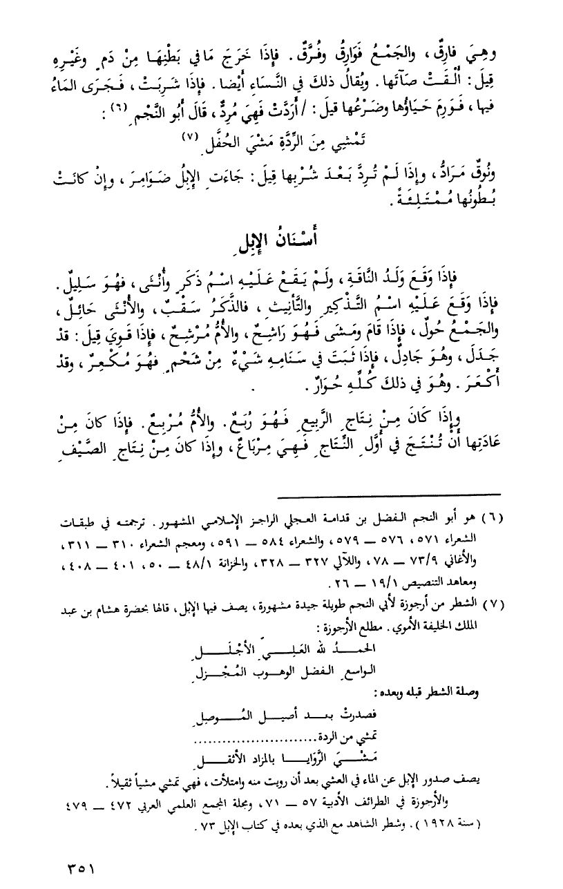 فإذا وقعَ ولدُ النَّاقةِ، ولمْ يقعْ عليهِ اسمُ ذكرٍ وأنثَى، فهوَ سليلٌ. فإذَا وقعَ عليهِ اسمُ التَّذكيرِ والتَّأنيثِ، فالذَّكرُ سقبٌ، والأنثَى حائلٌ، والجمعُ حولٌ، فإذا قامَ ومشى فهوَ راشحٌ، والأمُّ مرشحٌ، فإذا قويَ قيلَ: قدْ جدلَ، وهوَ جادلٌ، فإذا ثبتَ فِي سنامهِ شيءٌ منْ شحمٍ فهوَ مكعرٌ، وقدْ أكعرَ. وهوَ فِي ذلكَ كلِّهِ حوارٌ.