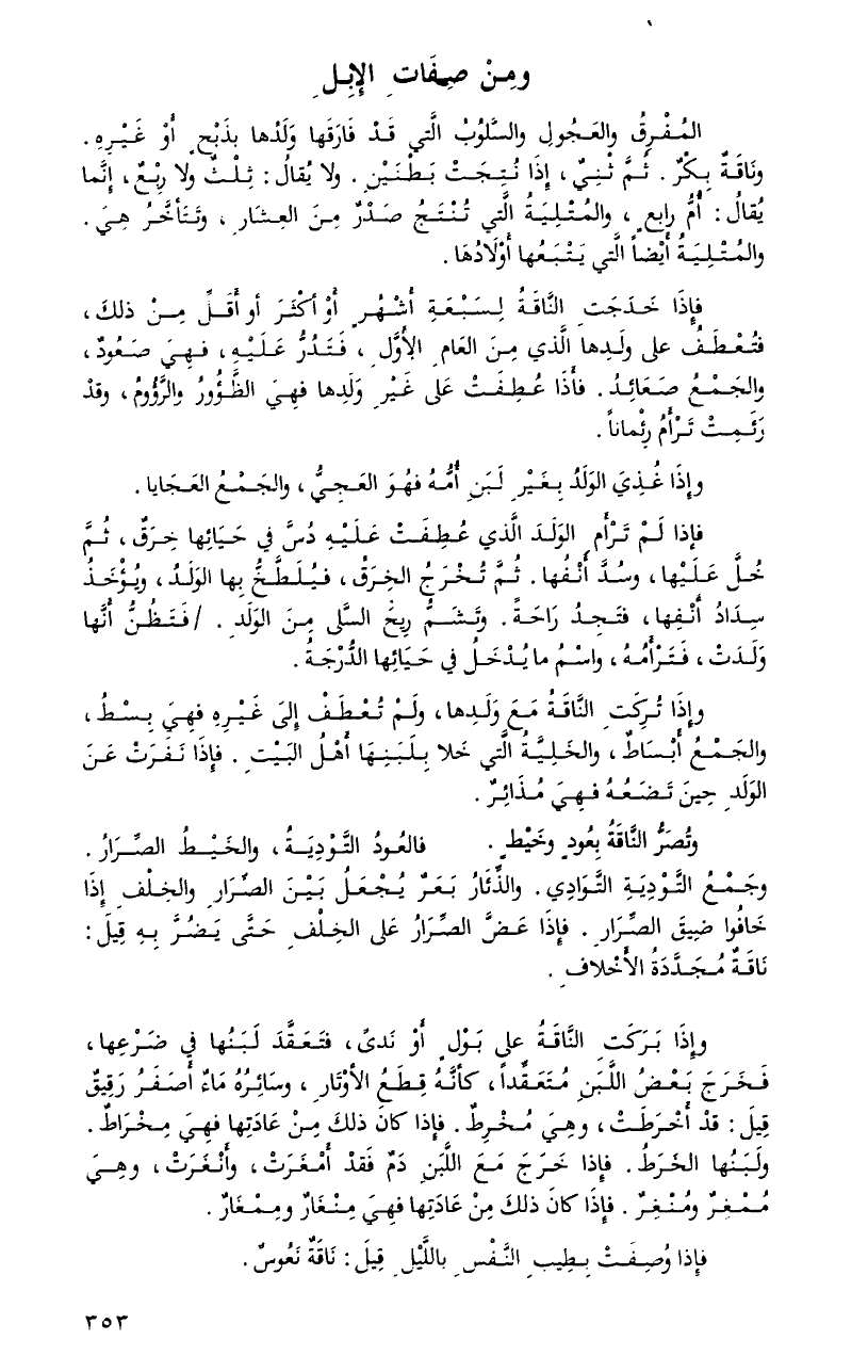 المفرقُ والعجولِ والسَّلوبُ الَّتِي قدْ فارقَها وَلَدُها بذبحٍ أوْ غيرِهِ. وناقةٌ بكرٌ. ثمَّ ثنيٌ، إِذَا نتجَتْ بطنينِ. ولا يُقالُ: ثلثٌ ولا ربعٌ، إنَّما يُقالُ: أمُّ رابعٍ، والمتليةُ الَّتِي تنتجُ صدرٌ منَ العشارِ، وتتأخَّرُ هيَ. والمتليةُ أيضاً التي يبتعُها أولادهَا.