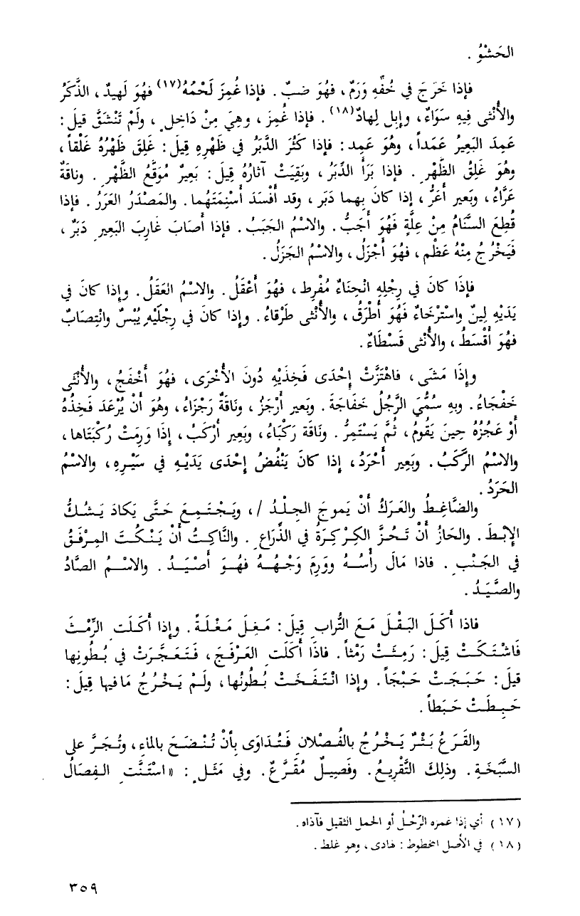 وإذَا مشَى، فاهتزَّتْ إحدَى فخذيهِ دونَ الأخرَى، فهوَ أخفجُ، والأنثَى خفجاءُ. وبهِ سُمِّيَ الرَّجلُ خفاجةَ. وبعير أرجزُ، وناقةٌ رجزاءُ، وهوَ أنْ يرعدَ فخذهُ أو عجزهُ حينَ يقومُ، ثمَّ يستمرُّ. وناقَة ركباءُ وبعير أركبُ، إِذَا ورمَتْ رُكبَتَاها، والاسمُ الرَّكبُ. وبعير أحردُ، إِذَا كانَ ينفضُ إحدَى يديهِ فِي سيرهِ والاسمُ الحردُ. والضَّاغطُ والعركُ أنْ يموجَ الجلدُ، ويجتمعَ حَتَّى يكادَ يشكُّ الإبطَ. والحازُ أنْ تحزَّ الكِركِرةُ فِي الذِّراعِ. والنَّاكتُ أنْ ينكتَ المرفقُ فِي الجنبِ. فإِذَا مالَ رأسهُ وورمَ وجههُ فهوَ أصيدُ. والاسمُ الصَّادُ والصَّيدُ.