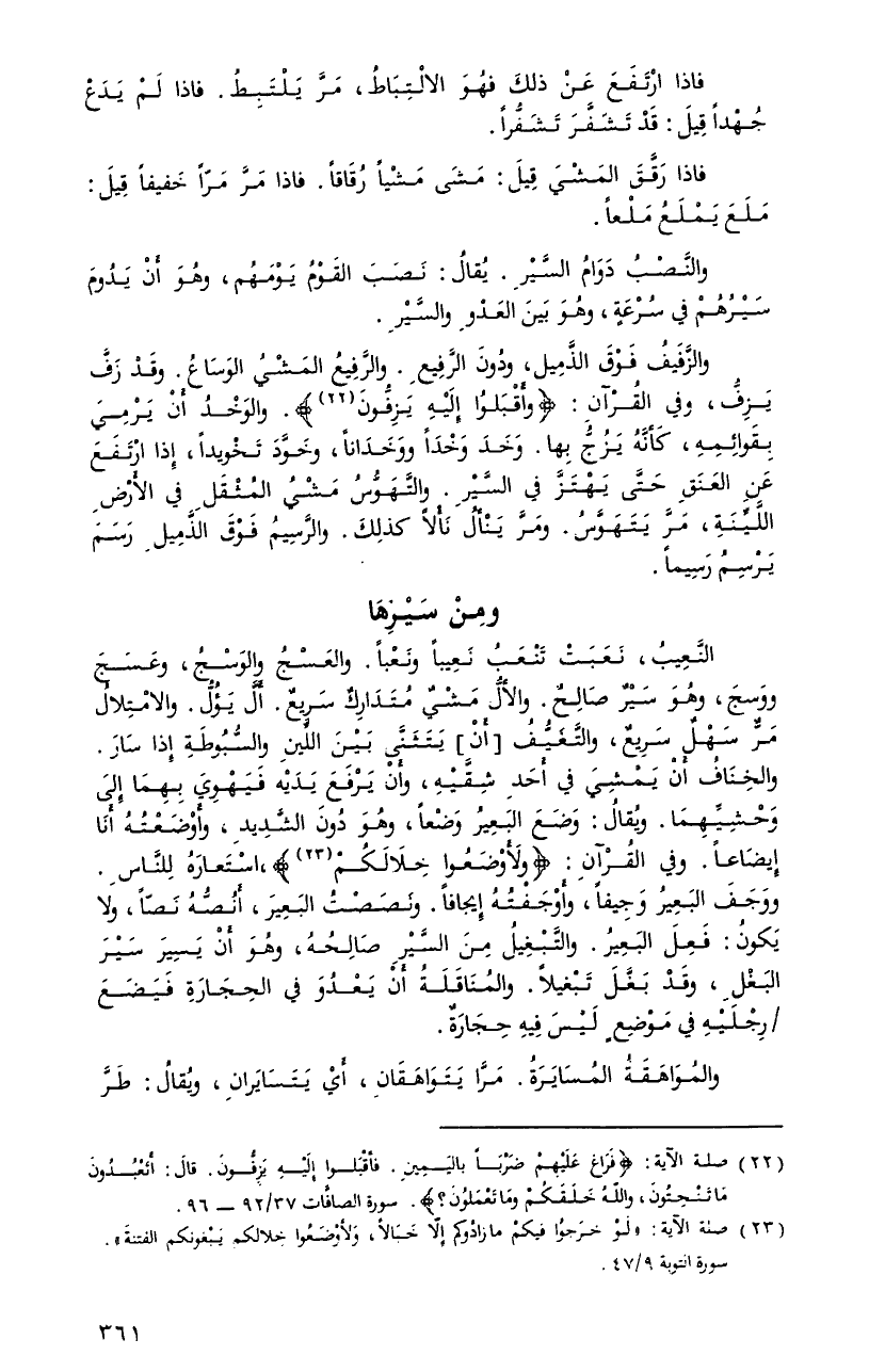 وحشيِّهمَا. ويُقالُ: وضعَ البَعيرُ وضعاً، وهوَ دونَ الشَّديدِ، وأوضعتهُ أنَا إيضاعاً. وفي القرآنِ: {ولأَوْضَعُواْ خِلاَلَكُمْ}، استعارهُ للنَّاسِ. ووجفَ البعيرُ وجيفاً، وأوجفتهُ إيجافاً. ونصصتُ البعيرَ، أنصُّهُ نصاً، ولا يكونُ: فعلَ البعيرُ. والتَّبغيلُ منَ السَّيرِ صالحهُ، وهوَ أنْ يسيرَ سيرَ البغلِ، وقدْ بغَّلَ تبغيلاً. والمناقلةُ أنْ يعدوَ فِي الحجارةِ فيضعَ رجليهِ فِي موضعٍ ليسَ فيهِ حجارةٌ.