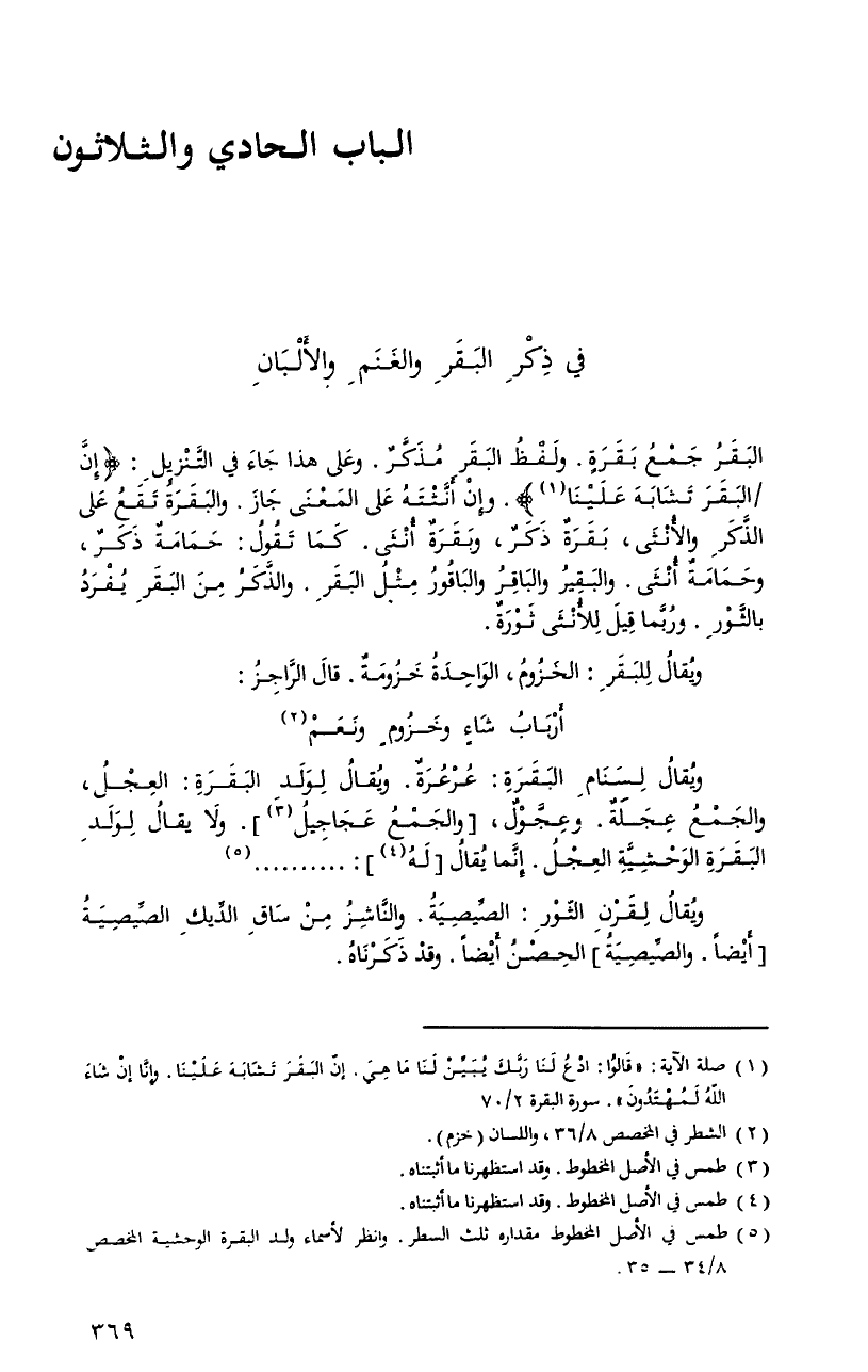 ويُقالُ لسنامِ البقرةِ: عرعرةٌ. ويُقالُ لولدٍ البقرةِ: العجلُ، والجمعُ عجلَةٌ وعجَّولٌ، والجمعُ عجاجيلُ ولا يُقالُ لولدِ البقرةِ الوحشيَّةِ العجلُ. إنَّما يُقالُ لهُ. . . . . ويُقالُ لقرنِ الثّورِ: الصيصيةُ. والنَّاشزُ منْ ساقِ الدِّيكِ الصِّيصيةُ أيضاً. والصِّيصيةُ الحصنُ أيضاً. وقدْ ذكرناهُ.