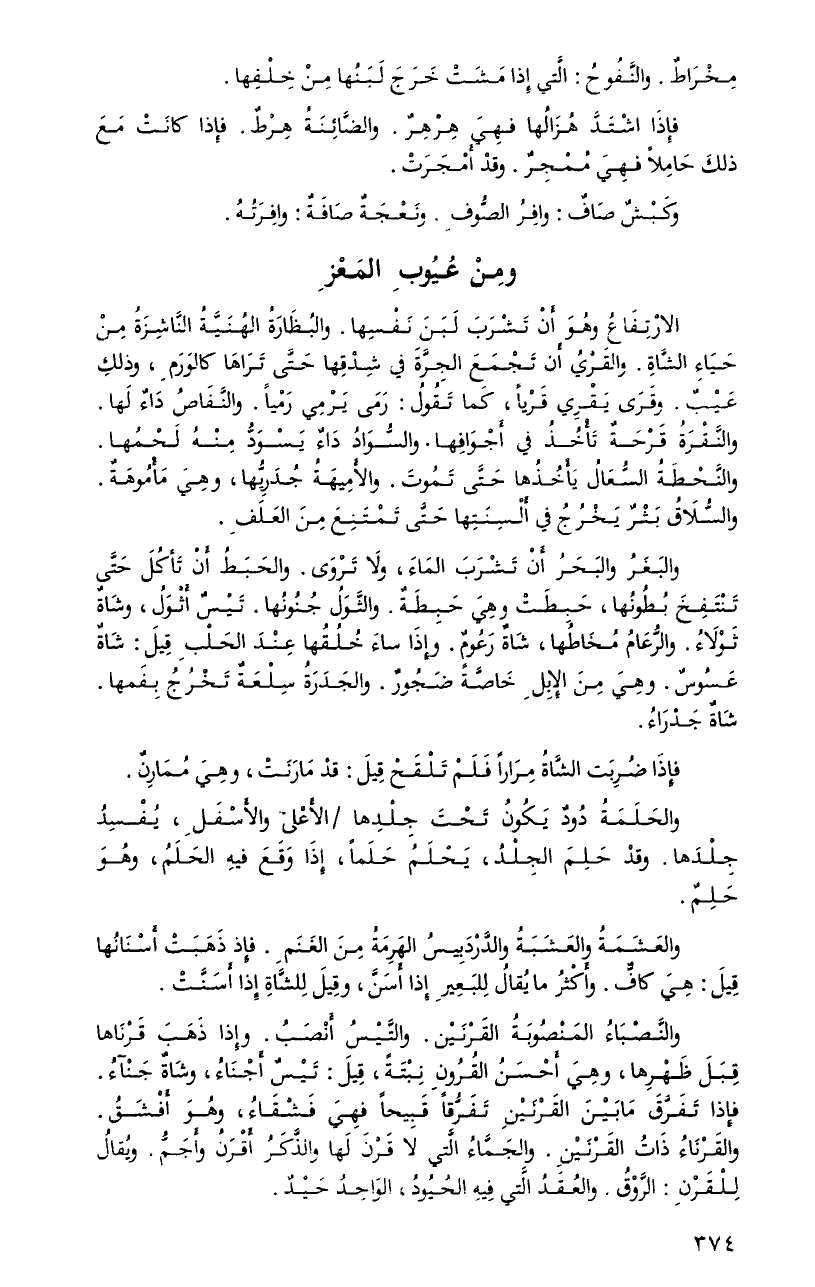الارتفاعُ وهوَ أنْ تشربَ لبنَ نفسِها. والبظارةُ الهنيَّةُ النَّاشزةُ منْ حياءِ الشَّاةِ. والقريُ أن تجمعَ الجرَّةَ فِي شدقِها حَتَّى تراهَا كالورمِ، وذلك عيبٌ. وقرى يقري قرياً، كَما تقولُ: رمَى يرمي رمياً. والنَّفاصُ داءٌ لَها. والنَّقرةُ قرحةٌ تأخذُ فِي أجوافِها. والسُّوادُ داءٌ يسودُّ منهُ لحمُها. والنَّحطةُ السُّعالُ يأخذُها حَتَّى تَمُوتَ. والأميهةُ جدريُّها، وهيَ مأموهَةٌ. والسُّلاقُ بثرٌ