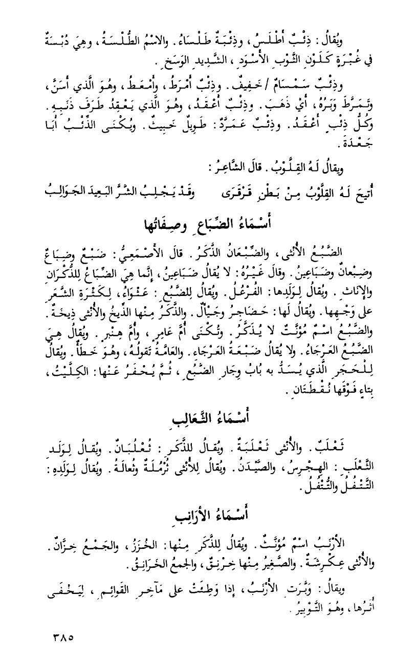 ثعلبٌ. والأنثى ثعلبةٌ. ويُقالُ للذَّكرِ: ثُعلبانٌ. ويُقالُ لولدِ الثَّعلبِ: الهجرسُ، والصَّيدنُ. ويُقالُ للأنْثى ثرملةٌ وثعالَةُ. ويُقالُ لولدهِ: التَّتفلُ والتُّتفلُ.