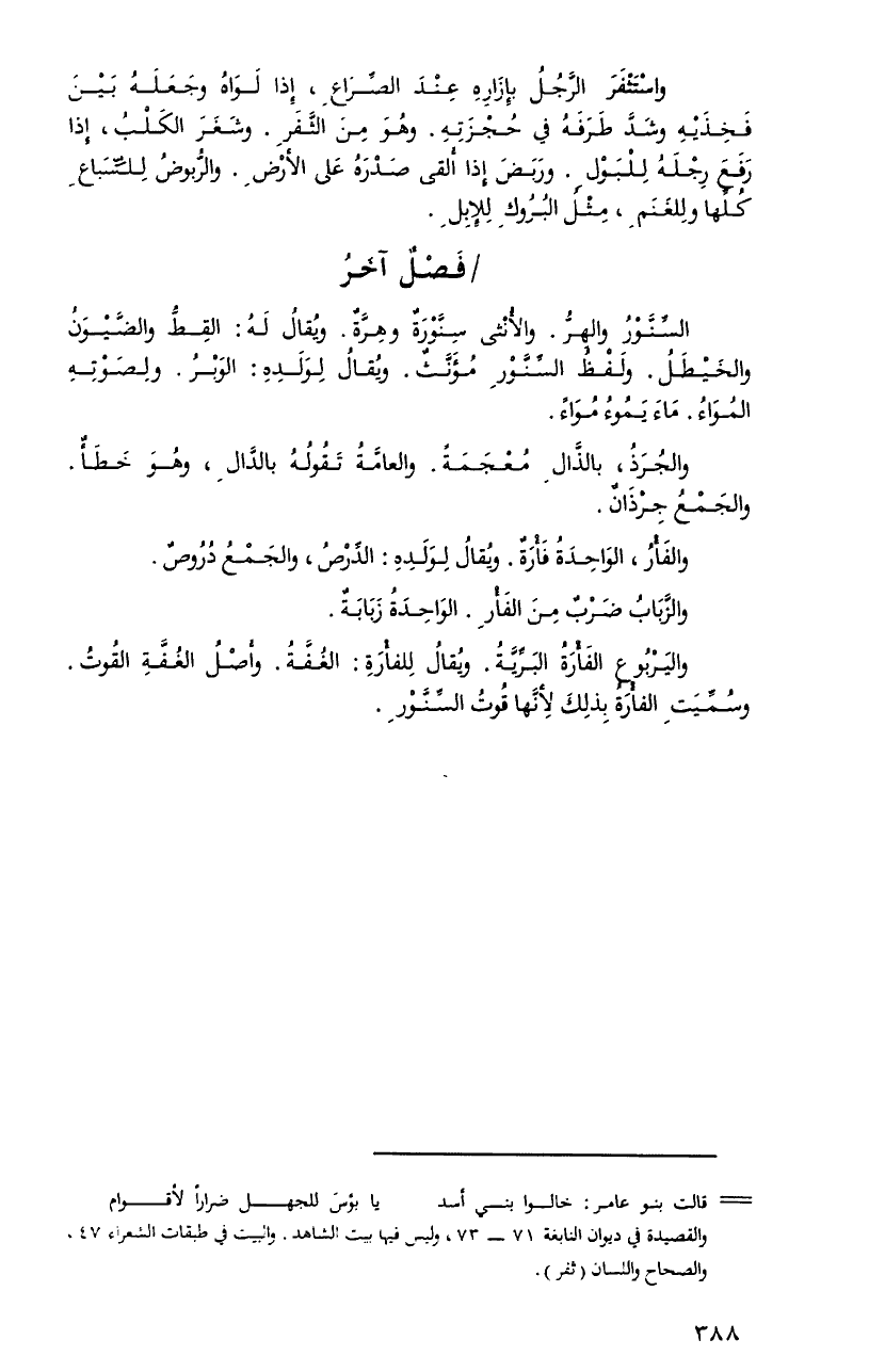 واستثفرَ الرَّجلُ بإزارهِ عندَ الصِّراعِ، إِذَا لواهُ وجعلهُ بينَ فخذيهِ وشدَّ طرفهُ فِي حجزتهِ. وهوَ منَ الثَّفرِ. وشغرَ الكلبُ، إِذَا رفعَ رجلهُ للبولِ. وربضَ إِذَا ألقى صدرهُ على الأرضِ. والرُّبوضُ للسِّباعِ كلِّها وللغنمِ، مثلُ البروكِ للإبلِ.