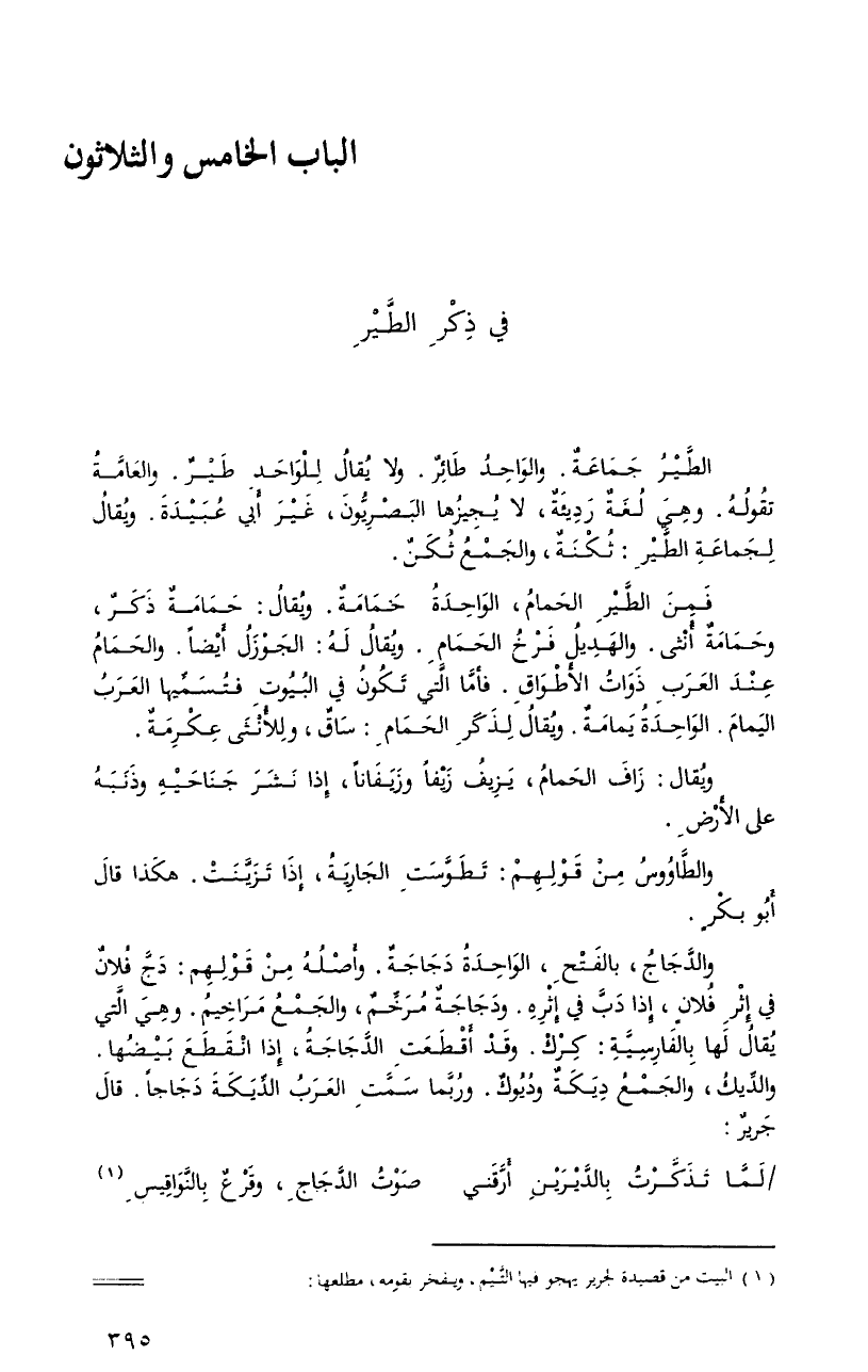 فمنَ الطَّيرِ الحمامُ، الوحدةُ حمامةٌ. ويُقالُ: حمامةٌ ذكرٌ، وحمامةٌ أنثى. والهديلُ فرخُ الحمامِ. ويُقالُ لهُ: الجوزلُ أيضاً. والحمامُ عندَ العربِ ذواتُ الأطواقِ. فأمَّا الَّتِي تكونُ فِي البيوتِ فتسمِّيها العربُ اليمامَ الواحدةُ يمامةٌ. ويُقالُ لذكرِ الحمامِ: ساقٌ، وللأنثَى عكرمةٌ.