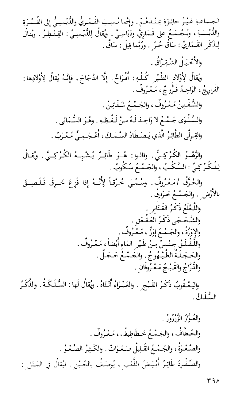 ويُقالُ لأولادِ الطِّيرِ كلِّهِ: أفراخٌ. إِلاَّ الدَّجاجَ، فإنَّهُ يُقالُ لأولادِها: الفراريجُ، الواحدُ فرُّوجٌ، معروفٌ.