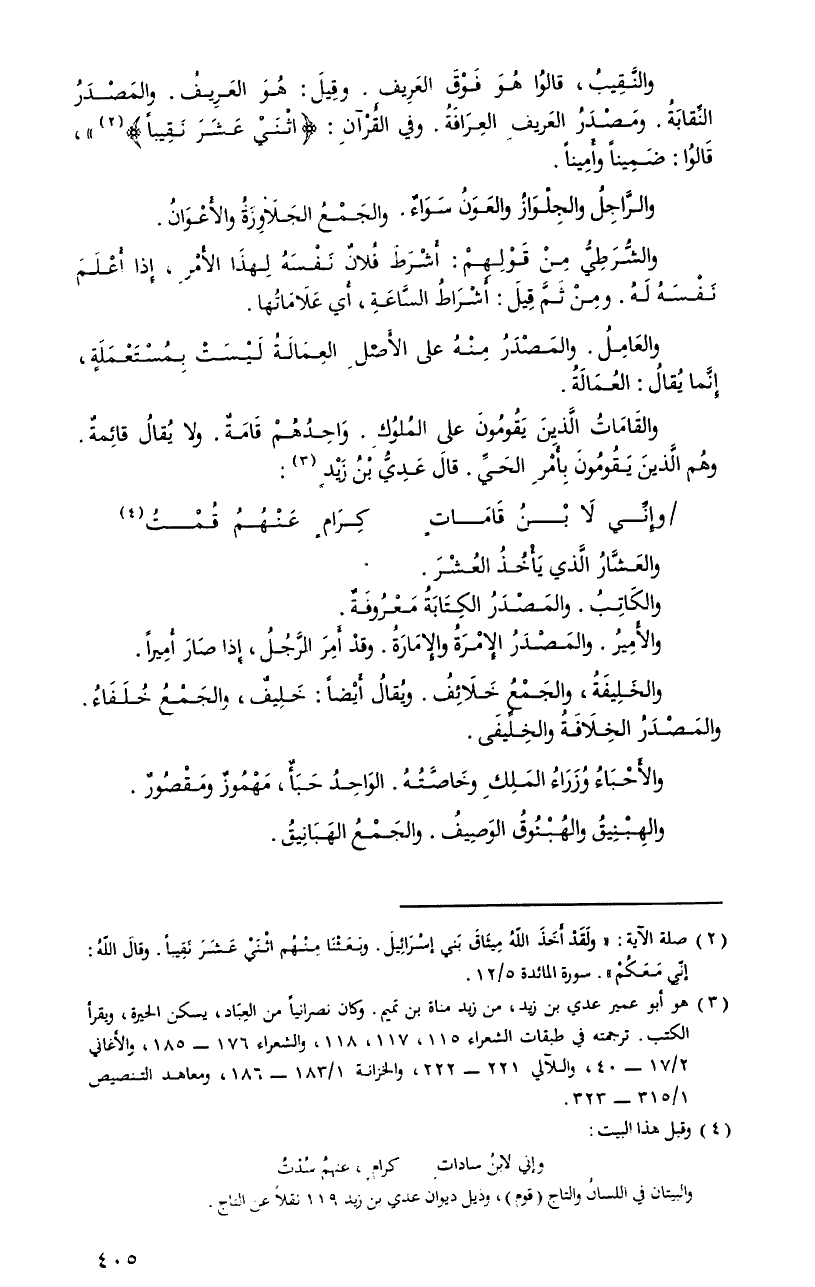 والنَّقيبُ، قَالُوا هوَ فوقَ العريفِ. وقيلَ: هوَ العريفُ. والمصدرُ النِّقابةُ. ومصدرُ العريفِ العرافةُ. وفي القرآنِ: {اثْنَيْ عَشَرَ نَقِيباً}، قَالُوا: ضميناً وأميناً.