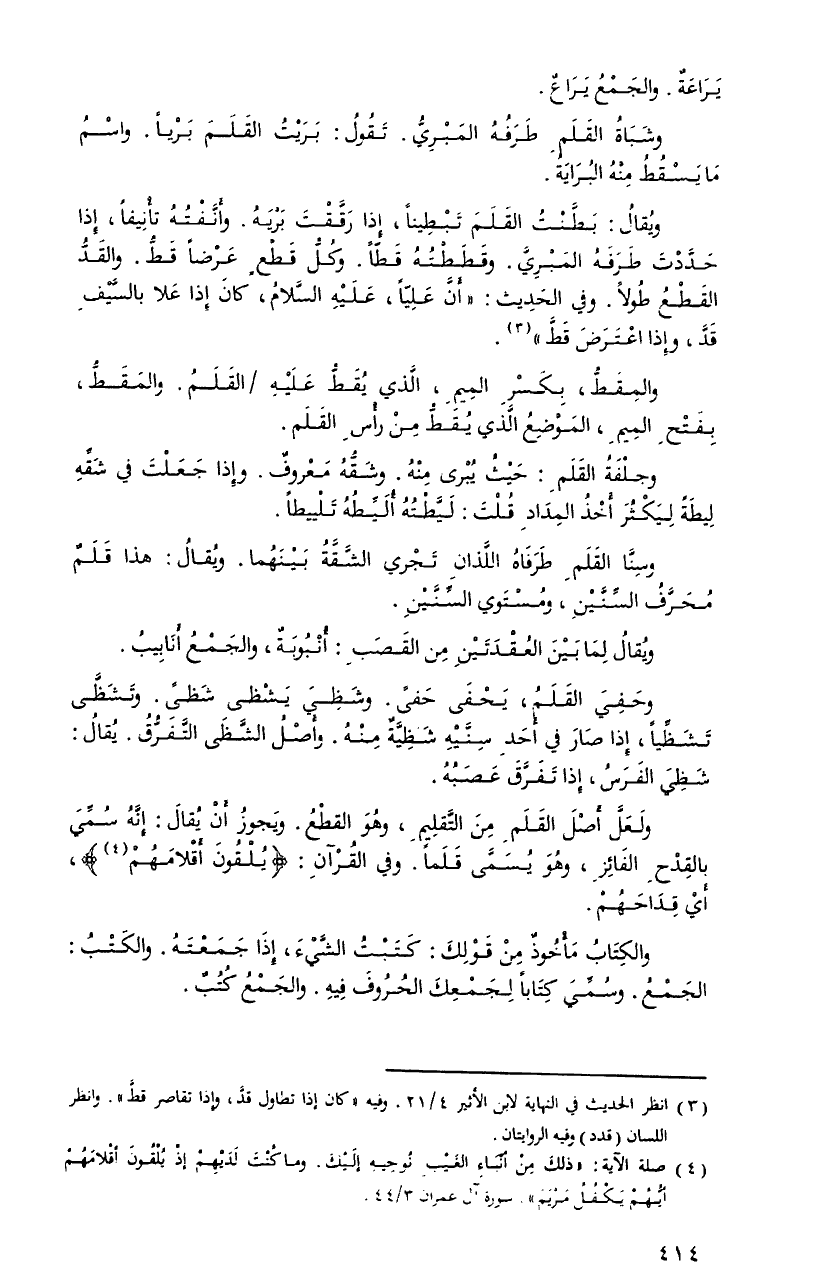 ولعلَّ أصلَ القلمِ منَ التَّقليمِ، وهوَ القطعُ. ويجوزُ أنْ يُقالُ: إنَّهُ سُمِّيَ بالقدحِ الفائزِ، وهوَ يسمَّى قلماً. وفي القرآنِ: {يُلْقُون أَقْلاَمَهُمْ}، أيْ قداحهُمْ.