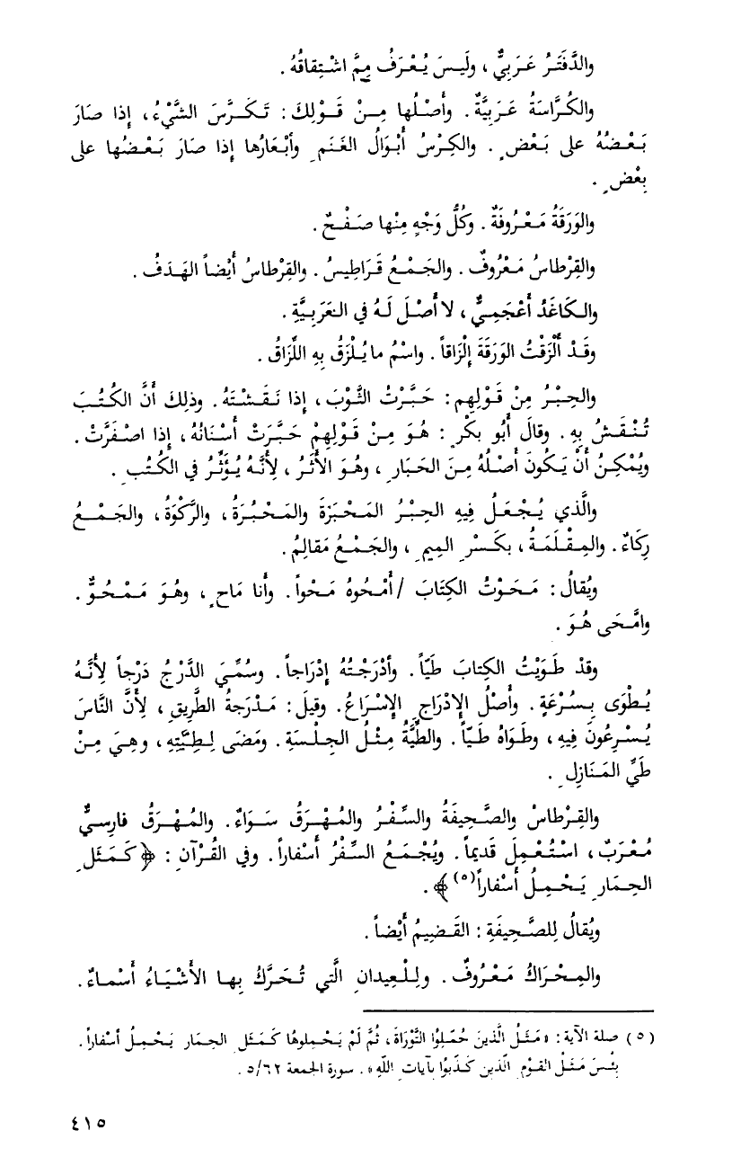 والقرطاسُ والصَّحيفةُ والسِّفرُ والمهرقُ سواءٌ. والمهرقُ فارسيٌّ معربٌ، استعملَ قديماً. ويجمعُ السِّفرُ أسفاراً. وفي القرآن: {كَمَثَلِ الْحِمَارِ يَحْمِلُ أَسْفَاراً}.