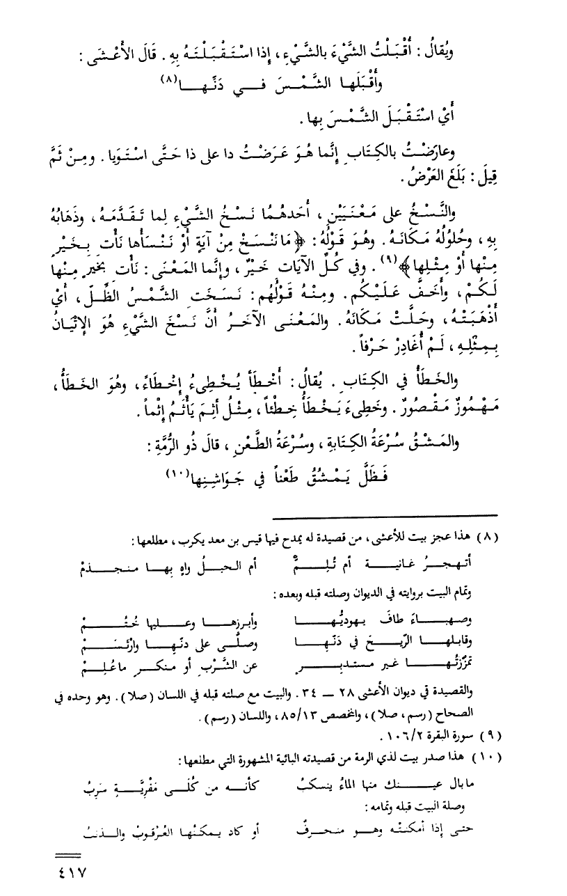 والنَّسخُ على معنيينِ، أحدهمُا نسخُ الشَّيءِ لِما تقدَّمهُ، وذهابهُ بهِ، وحلولهُ مكانهُ. وهوَ قولهُ: {مَا نَنسَخْ مِنْ آيَةٍ أَوْ نُنسِهَا نَأْتِ بِخَيْرٍ مِّنْهَا}. وفي كلِّ الآياتِ خيرٌ، وإنَّما المعنَى: نأتِ بخيرٍ منْها لكمْ، وأخفَّ عليكُم. ومنهُ قولهُم: نسختِ الشَّمسُ الظِّلّ، أيْ أذهبتهُ، وحلَّتْ مكانهُ. والمعنَى الآخرُ أنَّ نسخَ الشَّيءِ هوَ الإتيانُ بمثلهِ، لمْ أغادرْ حرفاً.