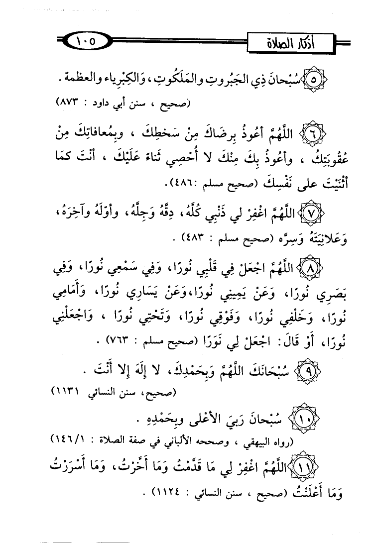 (6) اللَّهُمَّ أعُوذُ بِرضَاكَ مِنْ سَخطِكَ، وبِمُعافاتِكَ مِنْ عُقُوبَتِكُ، وأعُوذُ بِكَ مِنْكَ لا أُحْصِي ثَناءً عَلَيْكَ، أنْتَ كمَا أثْنَيْتَ على نَفْسِكَ (صحيح مسلم: 486).