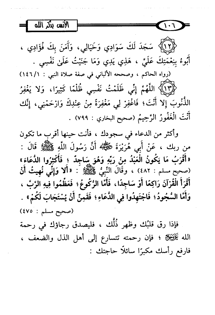 (13) اللَّهُمَّ إِنِّي ظَلَمْتُ نَفْسِي ظُلْمًا كَثِيرًا، وَلا يَغْفِرُ الذُّنُوبَ إِلا أَنْتَ؛ فَاغْفِرْ لِي مَغْفِرَةً مِنْ عِنْدِكَ وَارْحَمْنِي، إِنَّك أَنْتَ الْغَفُورُ الرَّحِيمُ (صحيح البخاري: 799).