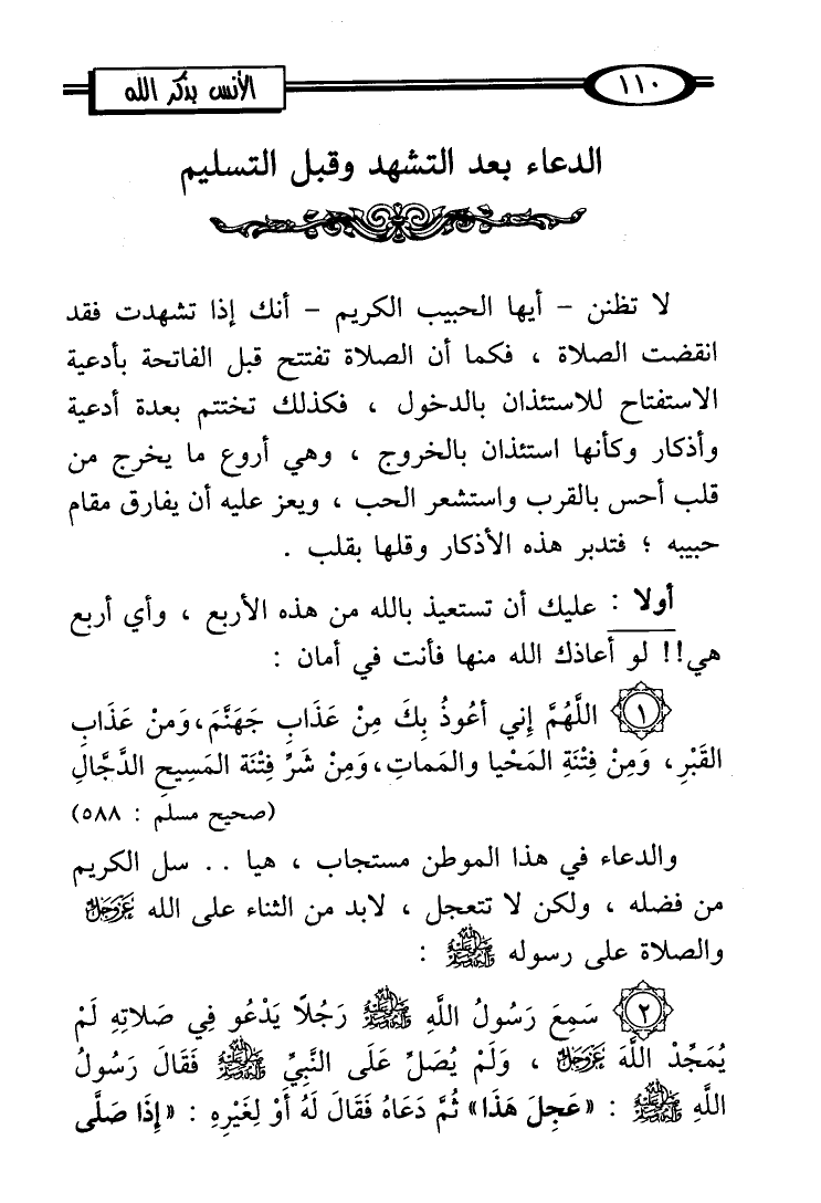 لا تظنن - أيها الحبيب الكريم - أنك إذا تشهدت فقد انقضت الصلاة، فكما أن الصلاة تفتتح قبل الفاتحة بأدعية الاستفتاح للإستئذان بالدخول، فكذلك تختتم بعدة أدعية وأذكار وكأنها استئذان بالخروج، وهي أروع ما يخرج من قلب أحس بالقرب واستشعر الحب، ويعز عليه أن يفارق مقام