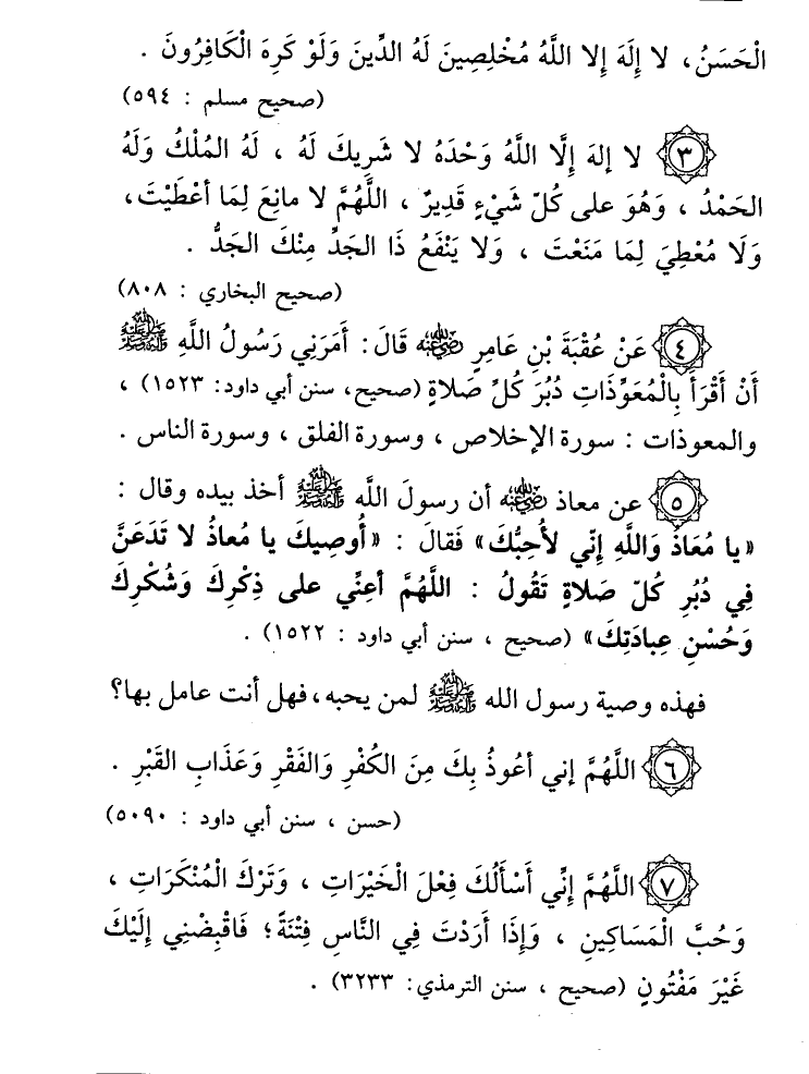 (4) عَنْ عُقْبَةَ بْنِ عَامِرٍ - رضي الله عنه - قَالَ: أَمَرَنِي رَسُولُ اللهِ - صلى الله عليه وسلم - أَنْ أَقْرَأ بِالْمُعَوِّذَاتِ دُبُرَ كُلِّ صَلاةٍ (صحيح، سنن أبي داود: 1523)،