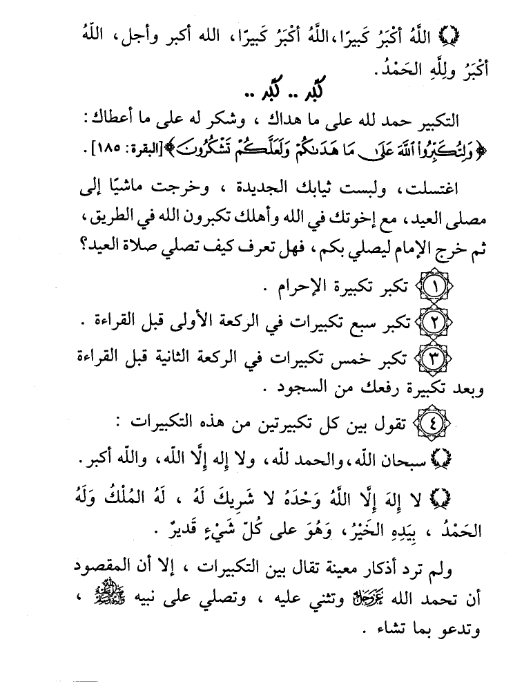 (4) تقول بين كل تكبيرتين من هذه التكبيرات: سبحان الله، والحمد لله، ولا إِله إِلاَّ الله، والله أكبر.