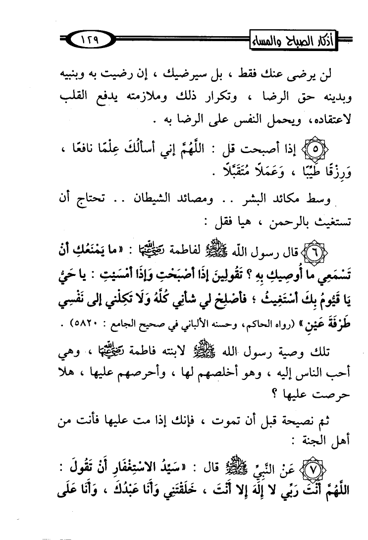 (6) قال رسول الله - صلى الله عليه وسلم - لفاطمة - رضي الله عنه -: "ما يَمْنَعُكِ أنّ تَسْمَعِي ما أُوصِيكِ بِهِ؟ تَقُولِينَ إذَا أصْبَحْتِ وَإذَا أمْسَيْتِ: يا حَيُّ يَا قَيُّومُ بِكَ أسْتَغِيثُ؛ فأصْلِحْ لي شأني كُلَّهُ وَلاَ تَكِلْني إلى نَفْسِي طَرْفَةَ عَيْنِ" (رواه الحاكم، وحسنه الألباني في صحيح الجامع: 5820).