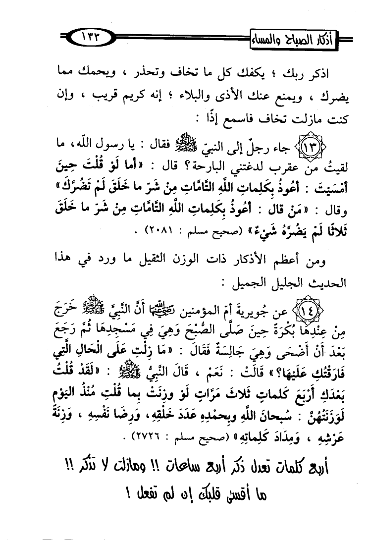 (13) جاء رجل إلى النبي - صلى الله عليه وسلم - فقال: يا رسول لله، ما لقيتُ عقرب لدغتني البارحة؟ قال: "أما لَوْ قُلْتَ حِينَ أمْسَيتَ: أعُوذُ بكَلِماتِ اللهِ التَّامَّاتِ مِنْ شَرّ ما خَلَقَ لَمْ تَضرَّكَ"