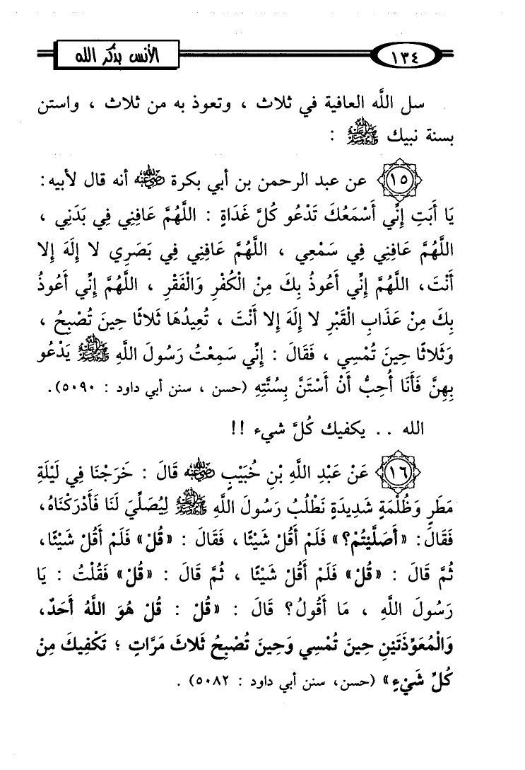 (15) عن عبد الرحمن بن أبي بكرة - رضي الله عنه - أنه قال لأبيه: يَا أبَتِ إِنِّي أسْمَعُكَ تَدْعُو كُلَّ غَدَاةٍ: اللَّهُمَّ عَافِنِي في بَدَنِي، اللَّهُمَّ عَافِنِي في سَمْعِي، اللَّهُمَّ عَافِنِي في بَصَرِي لا إِلَهَ إِلا أَنْتَ، اللَّهُمَّ إِني أَعُوذُ بِكَ مِنْ الْكُفْرِ وَالْفَقْرِ، اللَّهُمَّ إِني أَعُوذُ بِكَ مِنْ عَذَابِ الْقَبْرِ لا إِلَهَ إِلا أَنْتَ، تُعِيدُهَا ثَلاثًا حِينَ تُصْبحُ، وَثَلاثًا حِينَ تُمْسِي، فَقَالَ: إِنِّي سَمِعْتُ رَسُولَ اللهِ - صلى الله عليه وسلم - يَدْعُو بِهِنَّ فَأَنَا أحِبُّ أَنْ أَسْتَنَّ بِسُنَّتِهِ (حسن، سنن أبي داود: 5090).