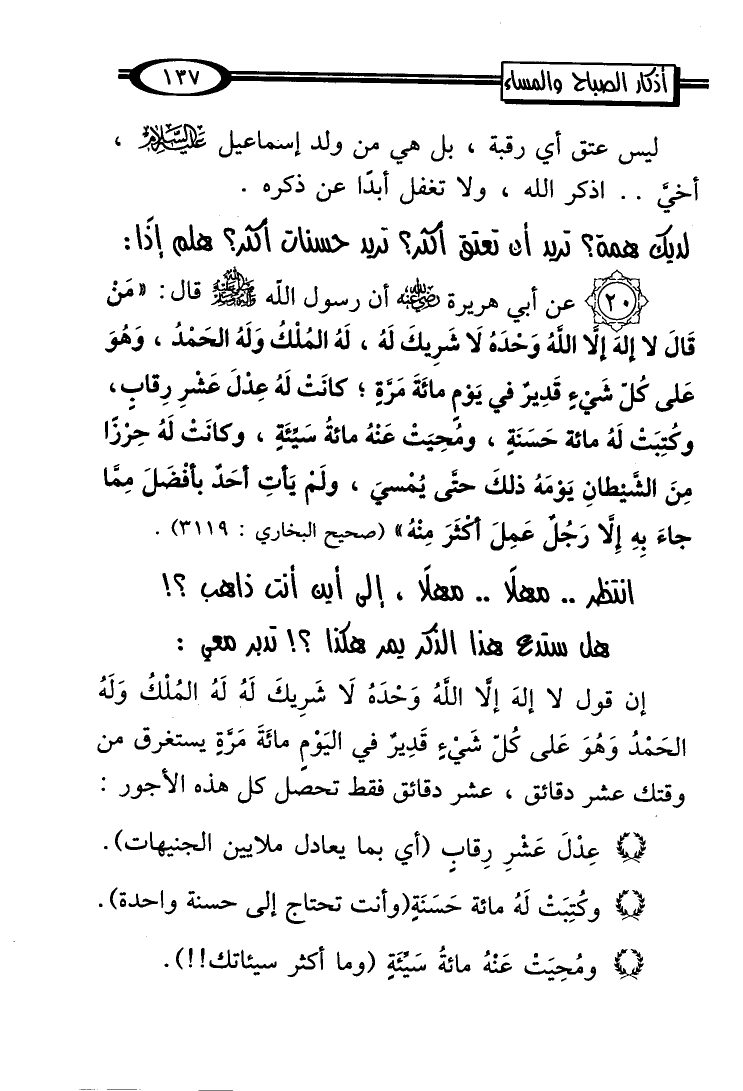 (20) عن أبي هريرة - رضي الله عنه - أن رسول الله - صلى الله عليه وسلم - قال: "مَنْ قَالَ لا إلهَ إلاَّ اللهُ وَحْدَهُ لاَ شَرِيكَ لَهُ، لَهُ المُلْكُ وَلَهُ الحَمْدُ، وَهُوَ عَلى كُلّ شَيءٍ قَدِيرٌ في يَوْمٍ مائَةَ مَرَّةٍ؛ كانَتْ لَهُ عِدْلَ عَشْرِ رِقابٍ، وكُتِبَتْ لَهُ مائة حَسَنَةٍ، ومُحِيَتْ عَنْهُ مائةُ سَيئَةٍ، وكانَتْ لَهُ حِرْزًا مِنَ الشَّيْطانِ يَومَهُ ذلكَ حتَّى يُمْسيَ، ولَمْ يَأتِ أحَدٌ بأفْضَلَ مِمَّا جاءَ بِهِ إِلَّا رَجُلٌ عَمِلَ أكْثَرَ مِنْهُ" (صحيح البخاري: 3119).