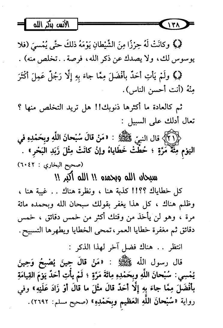 (21) قال النبيّ - صلى الله عليه وسلم -: "مَن قالَ سُبْحانَ اللهِ وبحَمْدِهِ في اليَوْمِ مِئَة مَرَّةٍ؛ حُطَّتْ خَطَاياهُ وإنْ كانَتْ مِثْلَ زَبَدِ الَبَحْرِ".