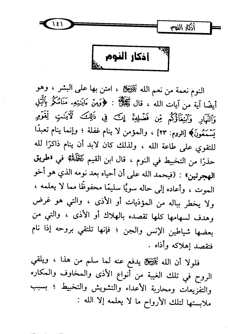 يَسْمَعُونَ} [الروم: 23]، والمؤمن لا ينام غفلة؛ وإنما ينام تعبدًا للتقوي على طاعة الله، ولذلك كان لا بد أن ينام ذاكرًا لله حذرًا من التخبيط في النوم، قال ابن القيم - رحمه الله - في "طريق الهجرتين": (فيحمد الله على أن أحياه بعد نومه الذي هو أخو الموت، وأعاده إلى حاله سويَّا سليمًا محفوظًا مما لا يعلمه، ولا يخطر بباله من المؤذيات أو الأذى، والتي هو غرض وهدف لسهامها كلها تقصده بالهلاك أو الأذى، والتي من بعضها شياطين الإنس والجن؛ فإنها تلتقي بروحه إذا نام فتقصد إهلاكه وأذاه.
