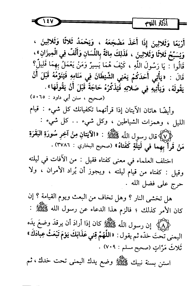 (7) قال رسول الله - صلى الله عليه وسلم -: "الآيَتانِ مِنْ آخِرِ سُورَةِ البَقَرَةِ مَنْ قَرأ بِهِما في لَيلَةٍ كفَتاهُ" (صحيح البخاري: 3786).