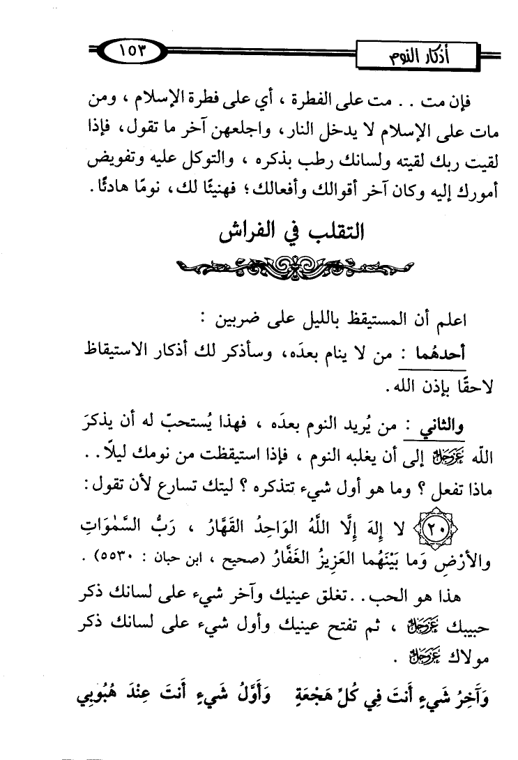 والثاني: من يُريد النوم بعدَه، فهذا يُستحبّ له أن يذكرَ الله - عز وجل - إلى أن يغلبه النوم، فإذا استيقظت من نومك ليلاً .. ماذا تفعل؟ وما هو أول شيء تتذكره؟ ليتك تسارع لأن تقول: