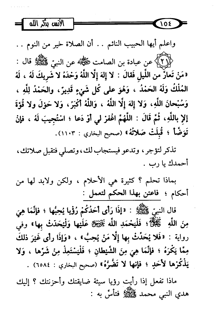 (21) عن عبادة بن الصامت - رضي الله عنه - عن النبي - صلى الله عليه وسلم - قال: "مَن تَعارَّ من اللَّيلِ فَقالَ: لا إِلهَ إِلَّا اللهُ وَحْدَهُ لا شَرِيكَ لَهُ، لَهُ المُلْكُ وَلَهُ الحَمْدُ، وَهُوَ على كُل شَيءٍ قَدِيرٌ، والحَمْدُ لله، وَسُبحانَ اللهِ، وَلا إِلهَ إِلا الله، وَاللهُ كبَرُ، وَلا حَوْلَ ولا قُوَّةَ إلأِ باللهِ، ثُم قَالَ: اللَّهُمَّ اغْفرْ لي أو دَعا؛ اسْتُجِيبَ لَهُ، فإنْ تَوَضَّأ؛ قُبِلَتْ صَلاُتهُ" (صحيح البخاري: 1103).