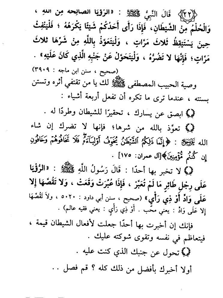 (22) قَال النبِيُّ - صلى الله عليه وسلم -:"الرّؤيَا الصالِحه مِن اللهِ، وَالْحُلْمُ مِنْ الشَّيطَانِ، فَإِذَا رَأَى أَحَدُكُمْ شَيْئَا يَكْرَهُهُ؛ فَلْيَنْفِثْ حِينَ يَسْتَيقِظُ ثَلاثَ مَرَّاتٍ، وَلْيَتَعَوَّذْ بِاللهِ مِنْ شَرِّهَا ثلاثَ مَرَّاتِ؛ فَإِنَّهَا لا تَضُرُّهُ، وَلْيَتَحَوَّل عَنْ جَنْبِهِ الذِي كَانَ عَلَيْهِ".