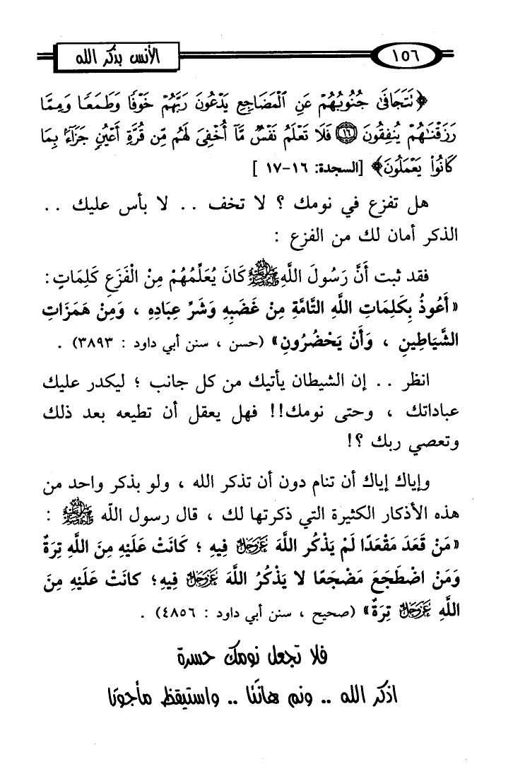 وإياك إياك أن تنام دون أن تذكر الله، ولو بذكر واحد من هذه الأذكار الكثيرة التي ذكرتها لك، قال رسول الله - صلى الله عليه وسلم -: "مَن قَعَدَ مَقعَدًا لَمْ يَذْكُر الله - عز وجل - فِيهِ؛ كَانَتْ عَلَيهِ مِنَ اللهِ تِرَةٌ وَمَنْ اضْطَجَعَ مَضْجَعَا لا يَذكُرُ الله - عز وجل - فِيهِ؛ كانَتْ عَلَيهِ مِنَ اللهِ - عز وجل - تِرَةٌ" (صحيح، سنن أبي داود: 4856).