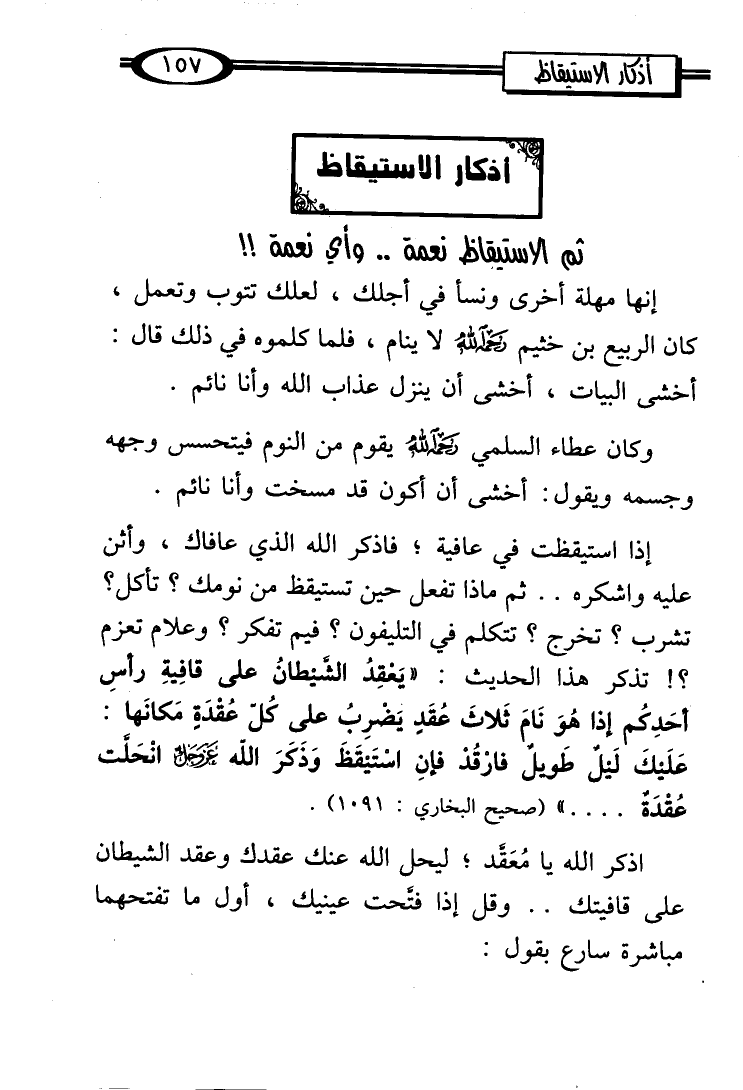 عَلَيْكَ لَيل طَويلٌ فارْقُدْ فإنِ اسْتَيقَظَ وَذَكَرَ الله - عز وجل - انْحَلَّت عُقْدَةٌ .... " (صحيح البخاري: 1091).