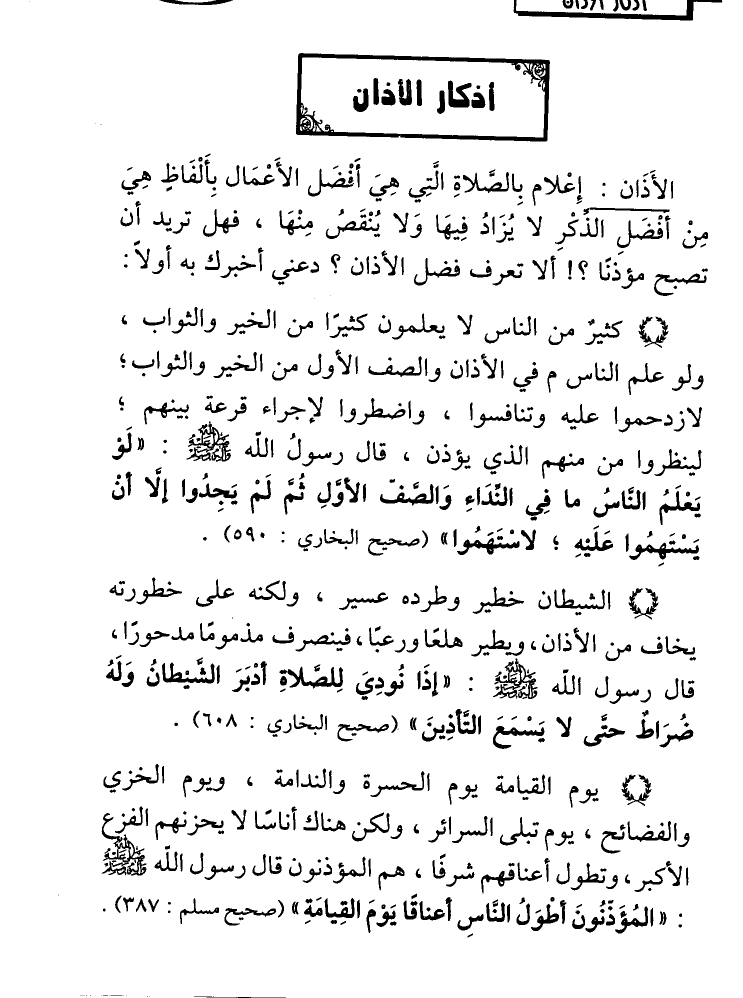 الأَذَان: إِعْلام بِالصَّلاةِ الَّتِي هِيَ أَفضَل الأَعْمَال بِأَلْفَاظٍ هِيَ مِنْ أفْضَلِ الذكْرِ لا يُزَادُ فِيهَا وَلا يُنْقَصُ مِنْهَا، فهل تريد أن تصبح مؤذنَا؟! ألا تعرف فضل الأذان؟ دعني أخبرك به أولاً: