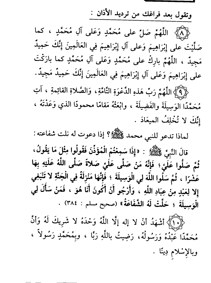 (10) أشْهَدُ أنْ لا إله إلا الله وَحْدَهُ لا شَرِيكَ لَهُ وَأن مُحَمَّدًا عَبْدُهُ وَرَسُولُهُ، رَضِيت باللهِ رَبُّا، وبِمُحَمَّدٍ رَسُولاً، وبالإِسْلامِ دِينًا.