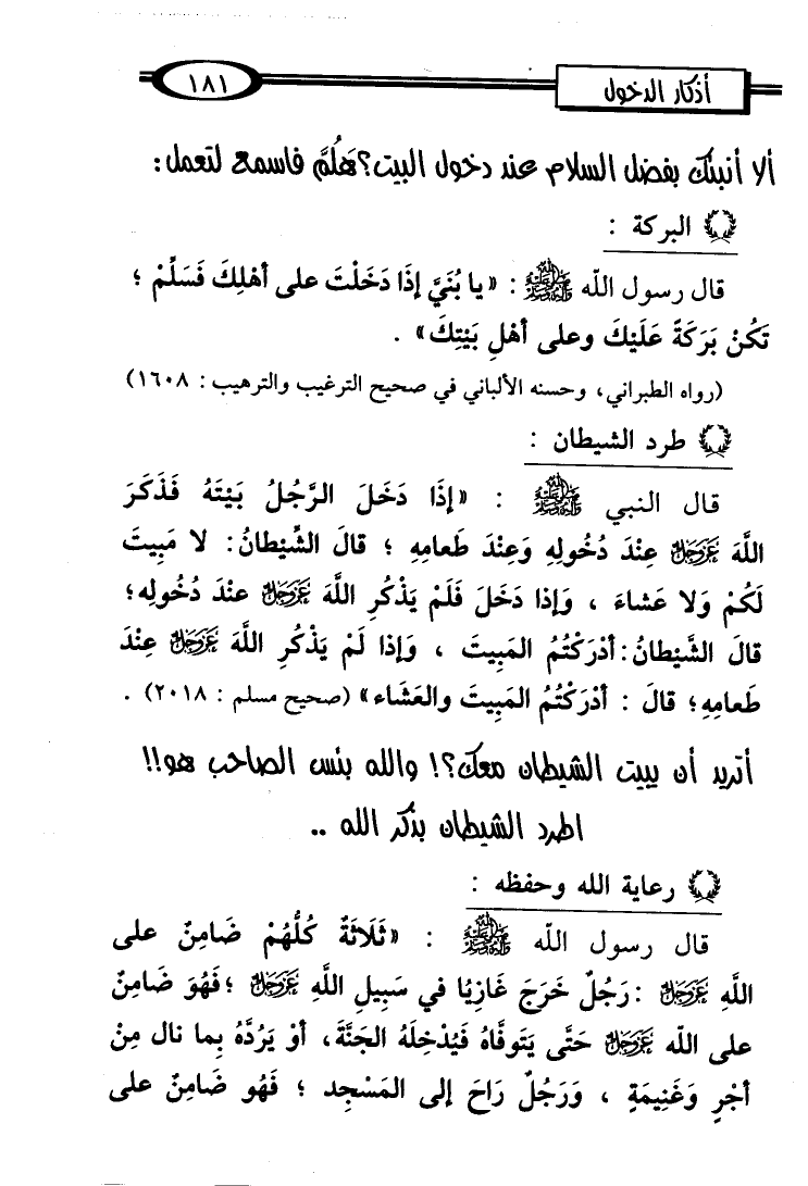 قال النبي - صلى الله عليه وسلم -: "إذا دَخَلَ الرجُلُ بَيتَهُ فَذَكَرَ الله عز وجل عِنْدَ دُخُولِهِ وَعِندَ طَعامِهِ؛ قالَ الشِّيطانُ: لا مَبِيتَ لَكُمْ وَلا عَشاءَ، وَإذا دَخَلَ فَلَمْ يَذْكرِ الله عز وجل عنْدَ دُخُولِه؟