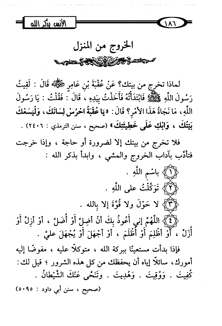 فلا تخرج من بيتك إلا لضرورة أو حاجة، وإذا خرجت فتأدَّب بآداب الخروج والمشي، وابدأ بذكر الله: