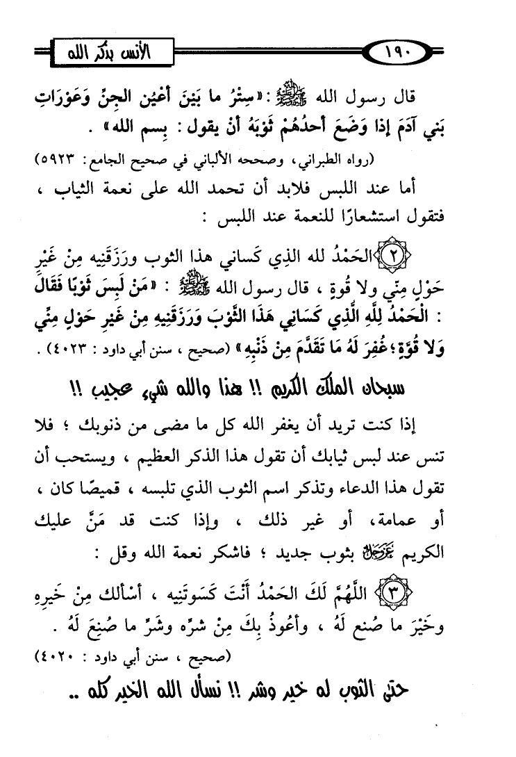 (2) الحَمْدُ لله الذِي كَساني هذا الثوب ورَزَقَنِيه مِنْ غَيْرِ حَوْلِ مِنّي ولا قُوةٍ، قال رسول الله - صلى الله عليه وسلم -: "مَنْ لَبِسَ ثَوْبًا فَقَالَ: الْحَمْدُ لِلَّهِ الَّذِي كَسَانِي هَذَا الثَّوْبَ وَرَزَقَنِيهِ مِنْ غَيْرِ حَوْلٍ مِنِّي وَلا قُوَّةٍ؛ غُفِرَ لَهُ مَا تَقَدَّمَ مِنْ ذَنْبِهِ" (صحيح، سنن أبي داود: 4023).