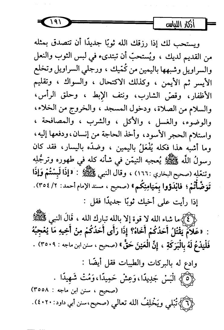 ويستحب لك إذا رزقك الله ثوبًا جديدًا أن تتصدق بمثله من القديم لديك، ويُستحبّ أن تبتدىء في لبس الثوب والنعل والسراويل وشبهها باليمين من كُمّيك، ورجلي السراويل وتخلع الأيسر ثم الأيمن، وكذلك الاكتحال، والسواك، وتقليم الأظفار، وقصّ الشارب، ونتف الإِبط، وحلق الرأس، والسلام من الصلاة، ودخول المسجد، والخروج من الخلاء، والوضوء، والغسل، والأكل، والشرب، والمصافحة، واستلام الحجر الأسود، وأخذ الحاجة من إنسان، ودفعها إليه، وما أشبه هذا فكله يُفْعَلُ باليمين، وضدّه باليسار، فقد كان رسولُ اللَّه - صلى الله عليه وسلم - يُعجبه التيمّن في شأنه كله في طهوره وترجُّلِه وتنعّلِه (صحيح البخاري: 166)، وقال النبي - صلى الله عليه وسلم -: "إذَا لَبِسْتُمْ وَإذَا تَوَضَّأْتُمْ؛ فابْدَؤوا بِمَيَامِنِكُم" (صحيح، مسند الإمام أحمد: 2/ 354).