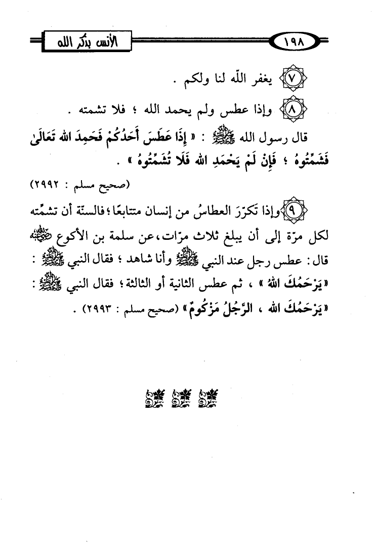 (9) وإذا تَكرّرَ العطاسُ من إنسان متتابعًا؛ فالسنّة أن تشمِّته لكل مرّة إلى أن يبلغ ثلاث مرّات، عن سلمة بن الأكوع - رضي الله عنه - قال: عطس رجل عند النبي - صلى الله عليه وسلم - وأنا شاهد؛ فقال النبي - صلى الله عليه وسلم -: "يَرْحَمُكَ اللهُ"، ثم عطس الثانية أو الثالثة؛ فقال النبي - صلى الله عليه وسلم -: "يَرْحَمُكَ الله، الرَّجُلُ مَزْكُومٌ" (صحيح مسلم: 2993).