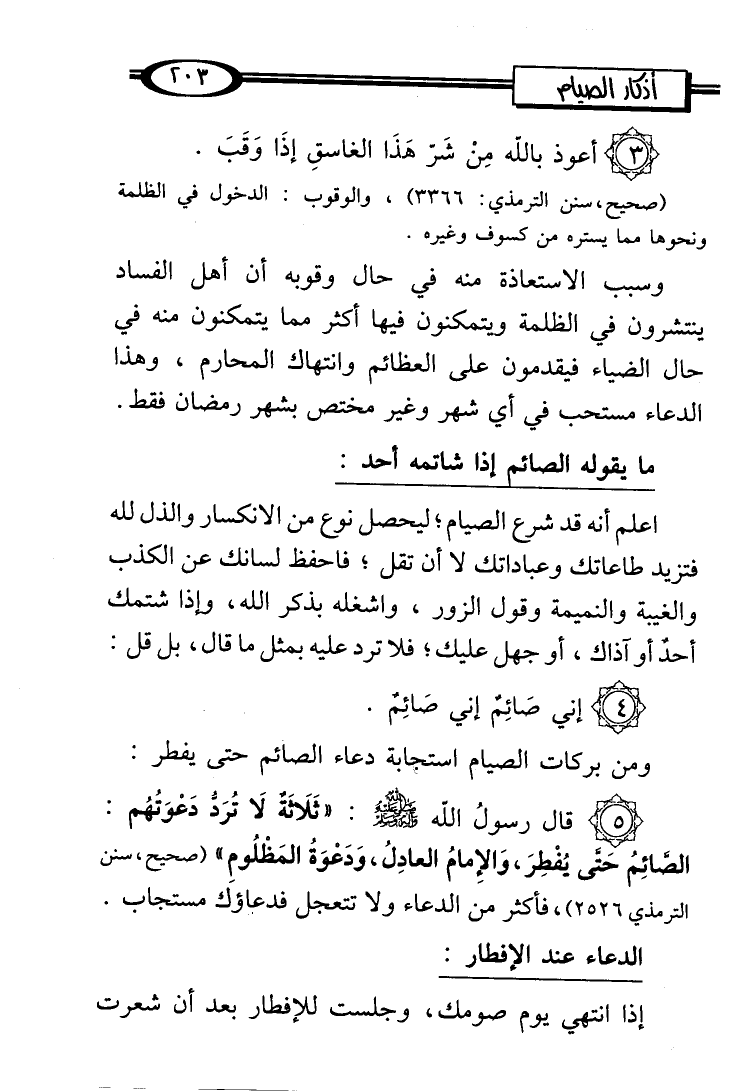 (5) قال رسولُ الله - صلى الله عليه وسلم -: "ثَلَاَثَةٌ لَا تُرَدُّ دَعْوَتُهُم: الصَّائِمُ حَتَّى يُفْطِرَ، وَالإِمامُ العادِلُ، وَدَعْوَةُ المَظْلُومِ" (صحيح، سنن