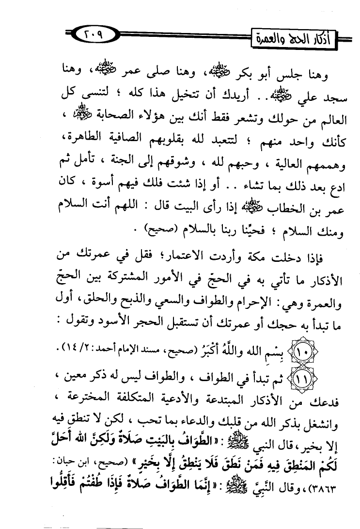 (11) ثم تبدأ فى الطواف، والطواف ليس له ذكر معين، فدعك من الأذكار المبتدعة والأدعية المتكلفة المخترعة، وانشغل بذكر الله من قلبك والدعاء بما تحب، لكن لا تنطق فيه إلا بخير، قال النبي - صلى الله عليه وآله وسلم -: "الطَّوَافُ بِالبَيتِ صَلَاةَ وَلَكِنَّ الله أَحَل لَكُمْ المَنطِقَ فِيهِ فَمَنْ نَطَقَ فَلَا يَنْطِقُ إِلَّا بِخَيرٍ" (صحيح، ابن حبان: 3863)، وقال النَّبِيّ - صلى الله عليه وآله وسلم -: "إِنما الطوَافُ صَلاة فَإِذَا طُفْتُمْ فَأَقِلُّوا