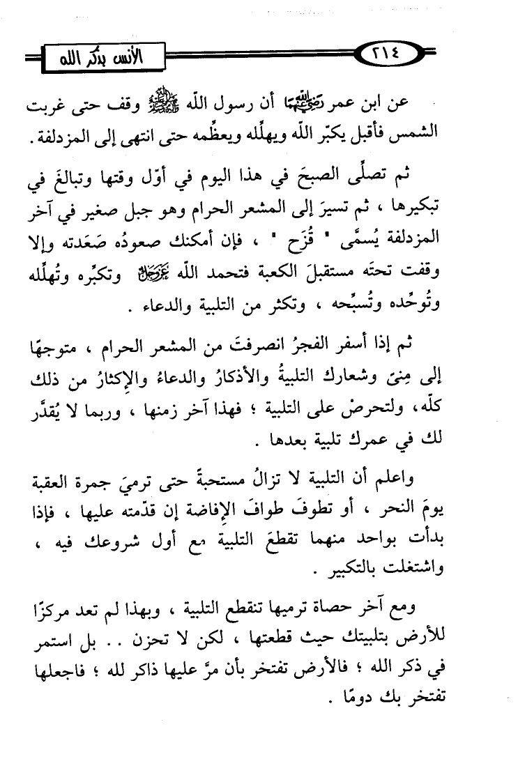 ثم إذا أسفر الفجرُ انصرفتَ من المشعر الحرام، متوجهًا إلى مِنىَ وشعارك التلبيةُ والأذكارُ والدعاءُ والإِكثارُ من ذلك كلّه، ولتحرصْ على التلبية. فهذا آخر زمنها، وربما لا يُقدَّر لك في عمرك تلبية بعدها.