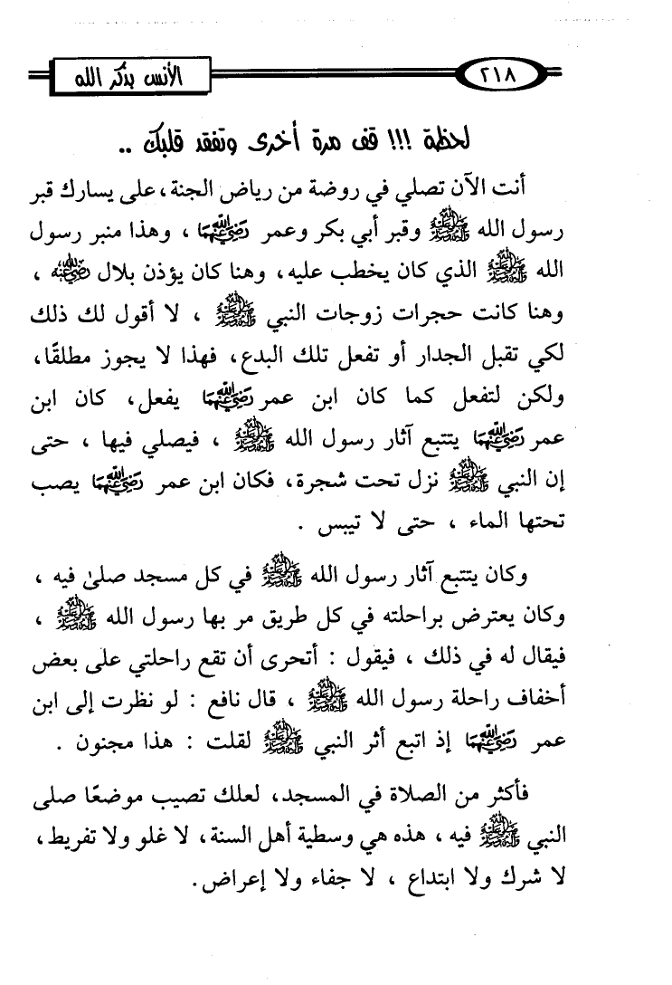 أنت الآن تصلي في روضة من رياض الجنة، على يسارك قبر رسول الله - صلى الله عليه وآله وسلم - وقبر أبي بكر وعمر - رضي الله عنهما -، وهذا منبر رسول الله - صلى الله عليه وآله وسلم - الذي كان يخطب عليه، وهنا كان يؤذن بلال - رضي الله عنه -، وهنا كانت حجرات زوجات النبي - صلى الله عليه وآله وسلم -، لا أقول لك ذلك لكي تقبل الجدار أو تفعل تلك البدع، فهذا لا يجوز مطلقًا، ولكن لتفعل كما كان ابن عمرو - رضي الله عنه - يفعل، كان ابن عمر - رضي الله عنه - يتتبع آثار رسول الله - صلى الله عليه وآله وسلم -، فيصلي فيها، حتى إن النبي - صلى الله عليه وسلم - نزل تحت شجرة، فكان ابن عمر - رضي الله عنه - يصب تحتها الماء، حتى لا تيبس.