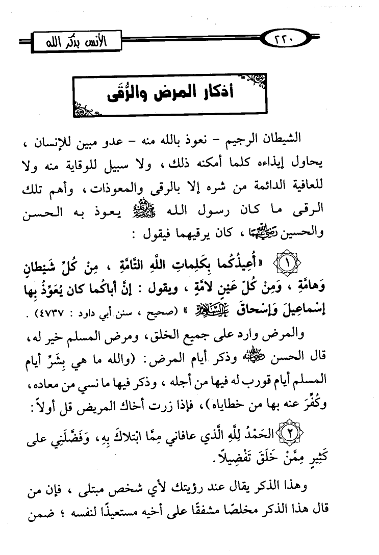 (1) أُعِيذُكُما بِكَلِماتِ الله التَّامَّةِ، مِنْ كُلِّ شَيطانٍ وَهامَّةِ، وَمِنْ كُلّ عَينٍ لامَّةِ، ويقول: إن أباكُما كان يُعَوِّذُ بِها إسماعِيلَ وَإسحاقَ - عليه السلام - (صحيح، سنن أبي داود: 4737).
